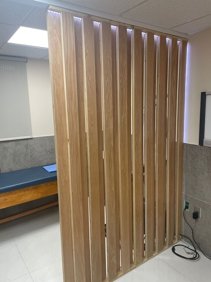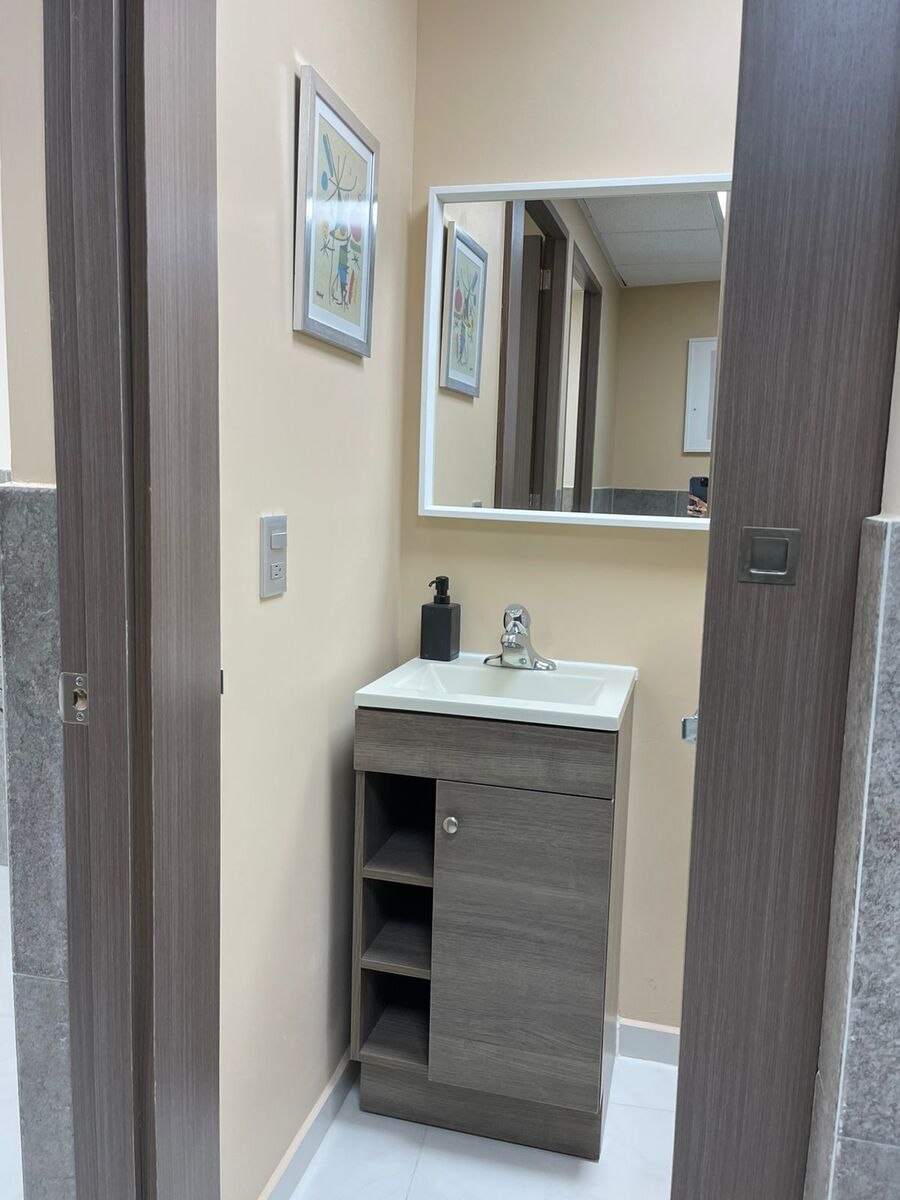 El consultorio interior o cubículo tiene 21 mts2, tiene un área especifica para exploración física o procedimientos menores con una lavamanos y un mamparo separa del área de consulta, con su escritorio y sillas.