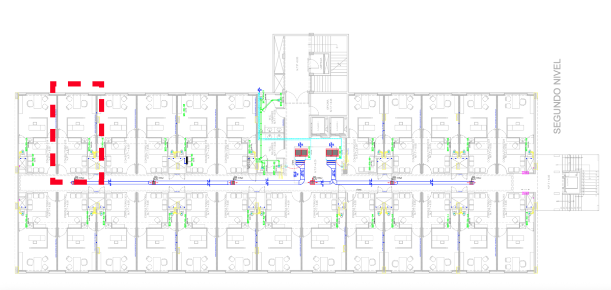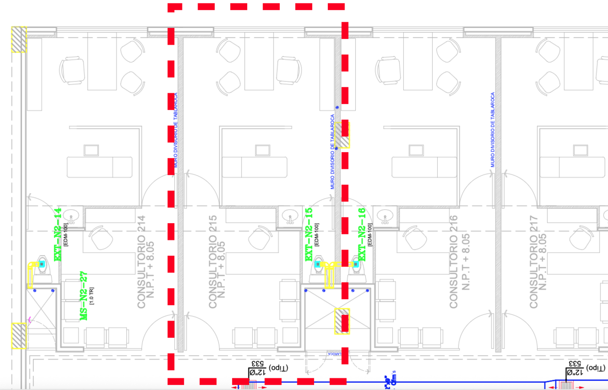 Muros divisorios entre consultorios, de tablaroca con aislamiento acústico.