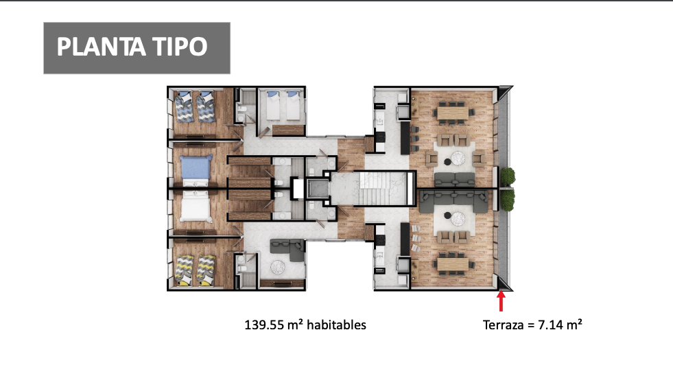 2 Recámaras cada una con baño propio, la principal con vestidor, sala-comedor, cocina, sala de TV, balcón, área de lavado, bodega.