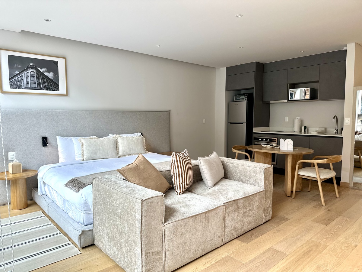 Quarto com banheiro completo, área de sala de estar e jantar, cozinha aberta.