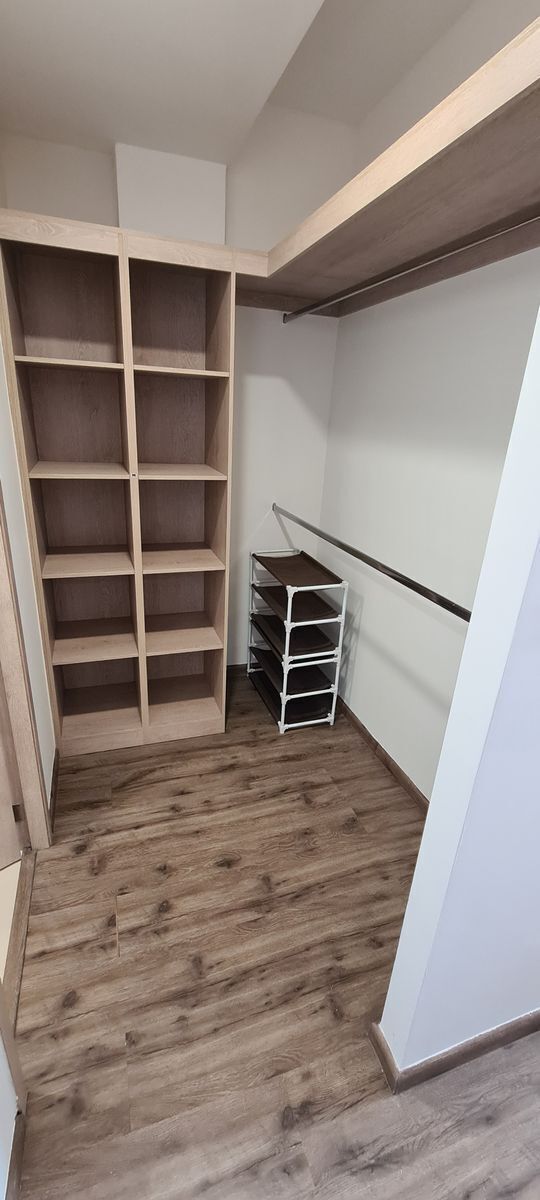 Quarto secundário com base e colchão em perfeito estado, penteadeira com espelho e armário.