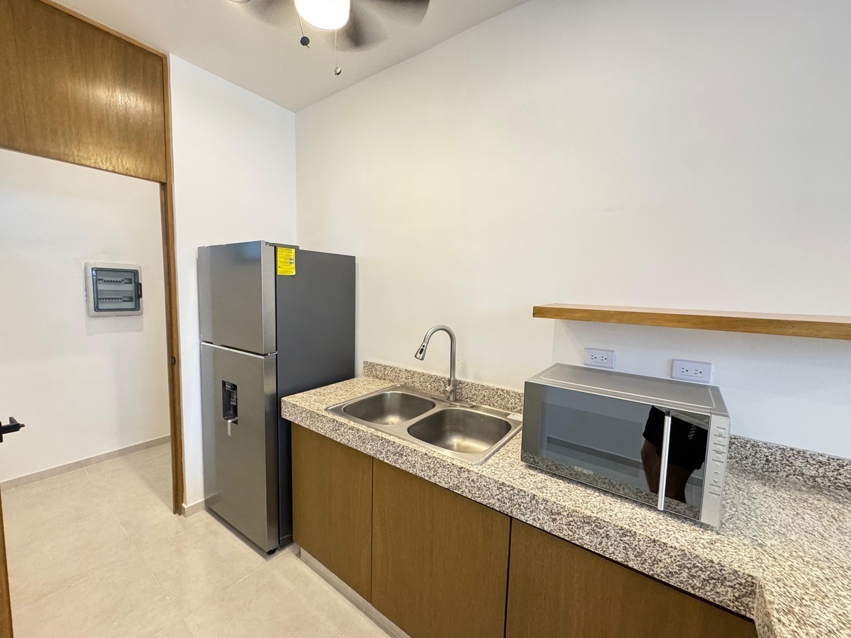 La cocina en open concept, está equipada con refrigerador, estufa eléctrica de 2 quemadores, horno de microondas.