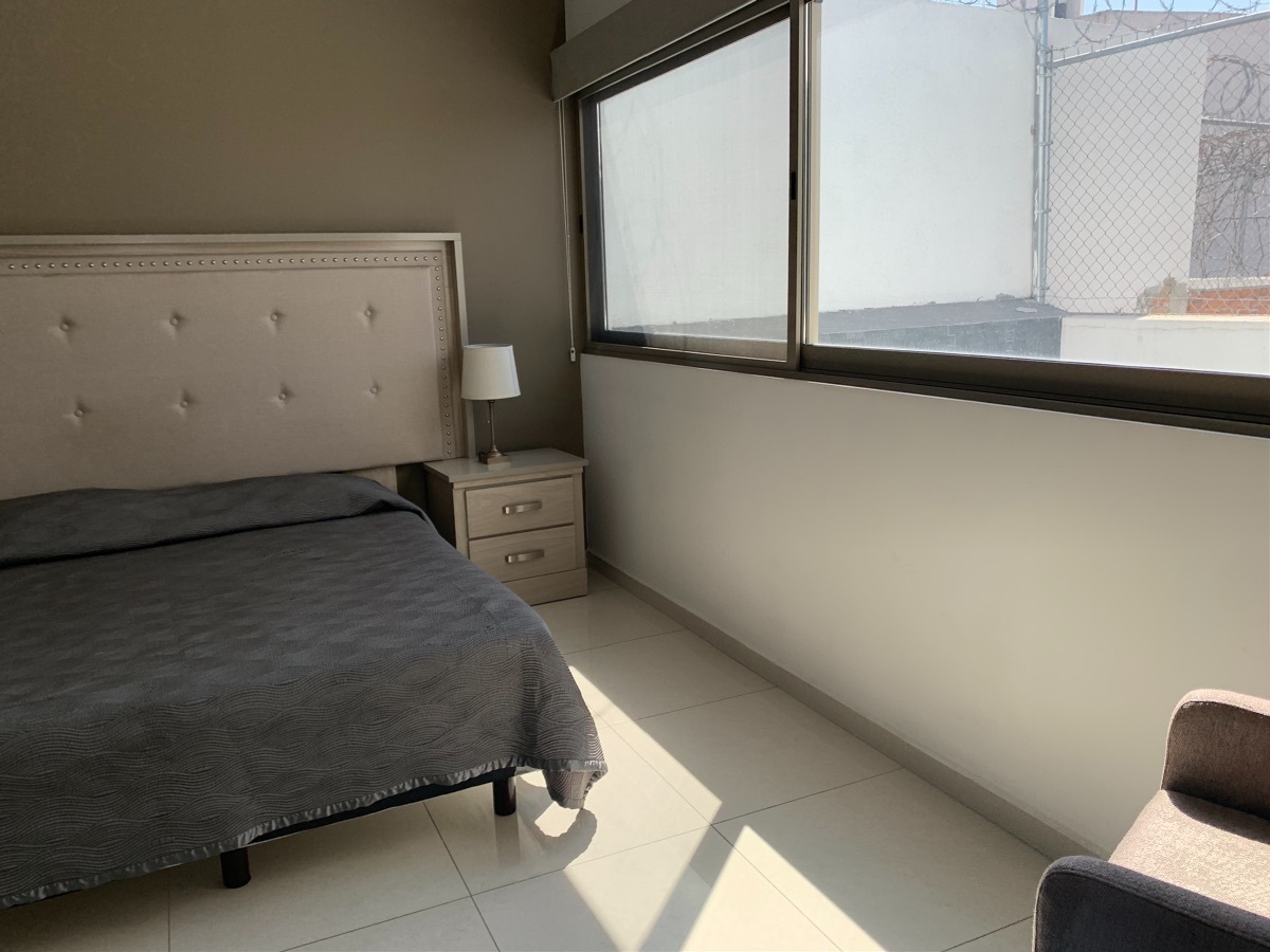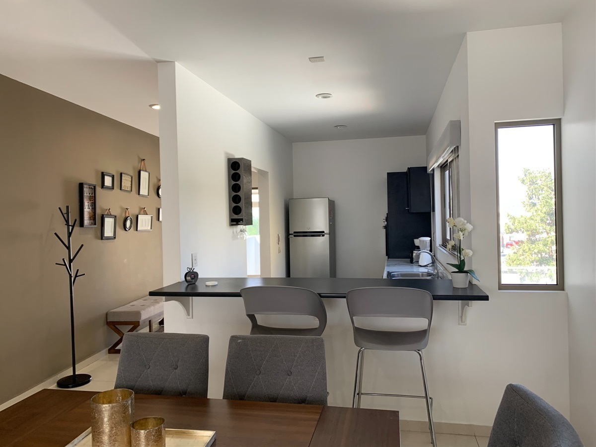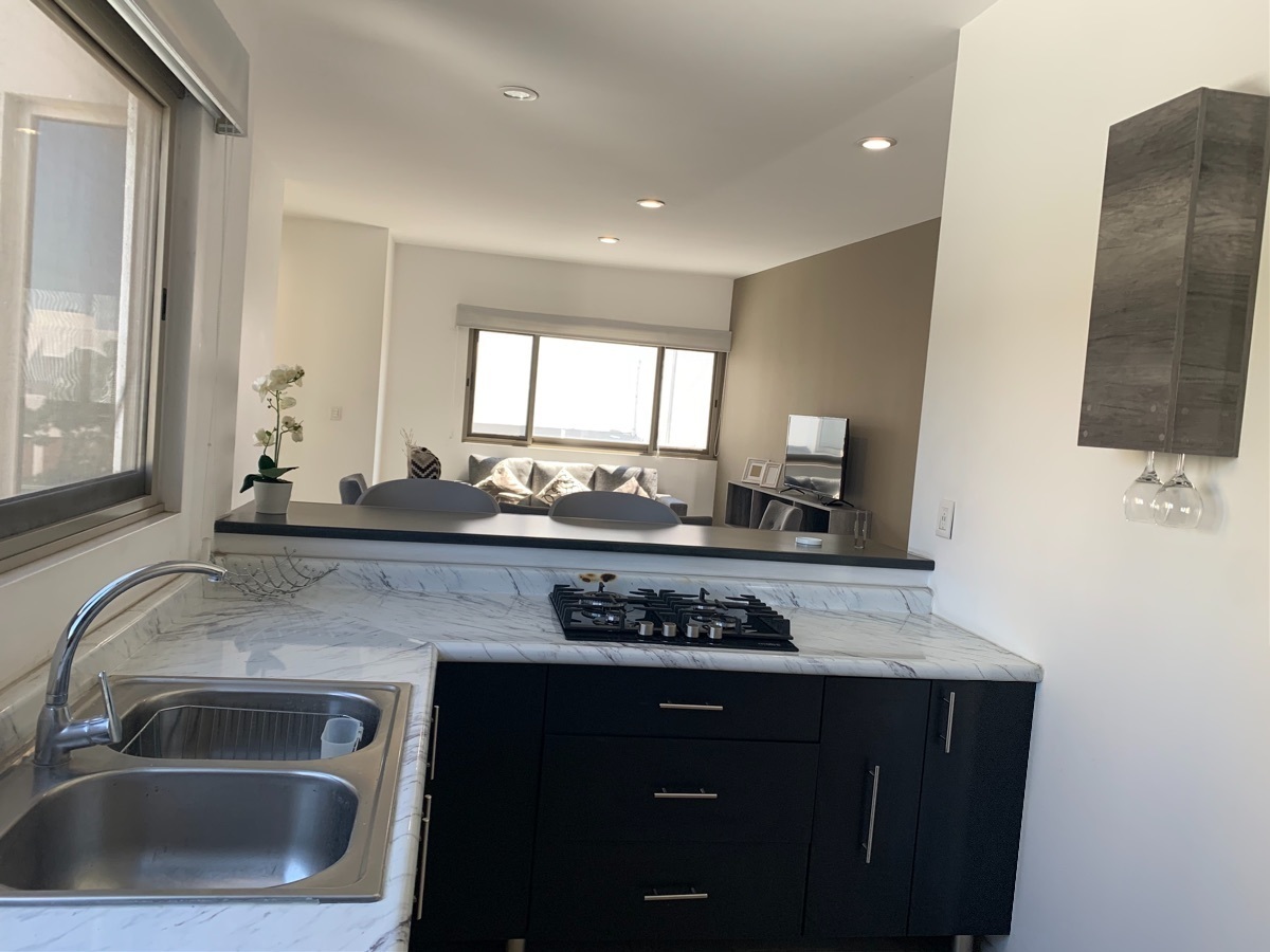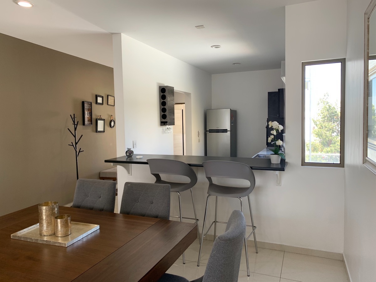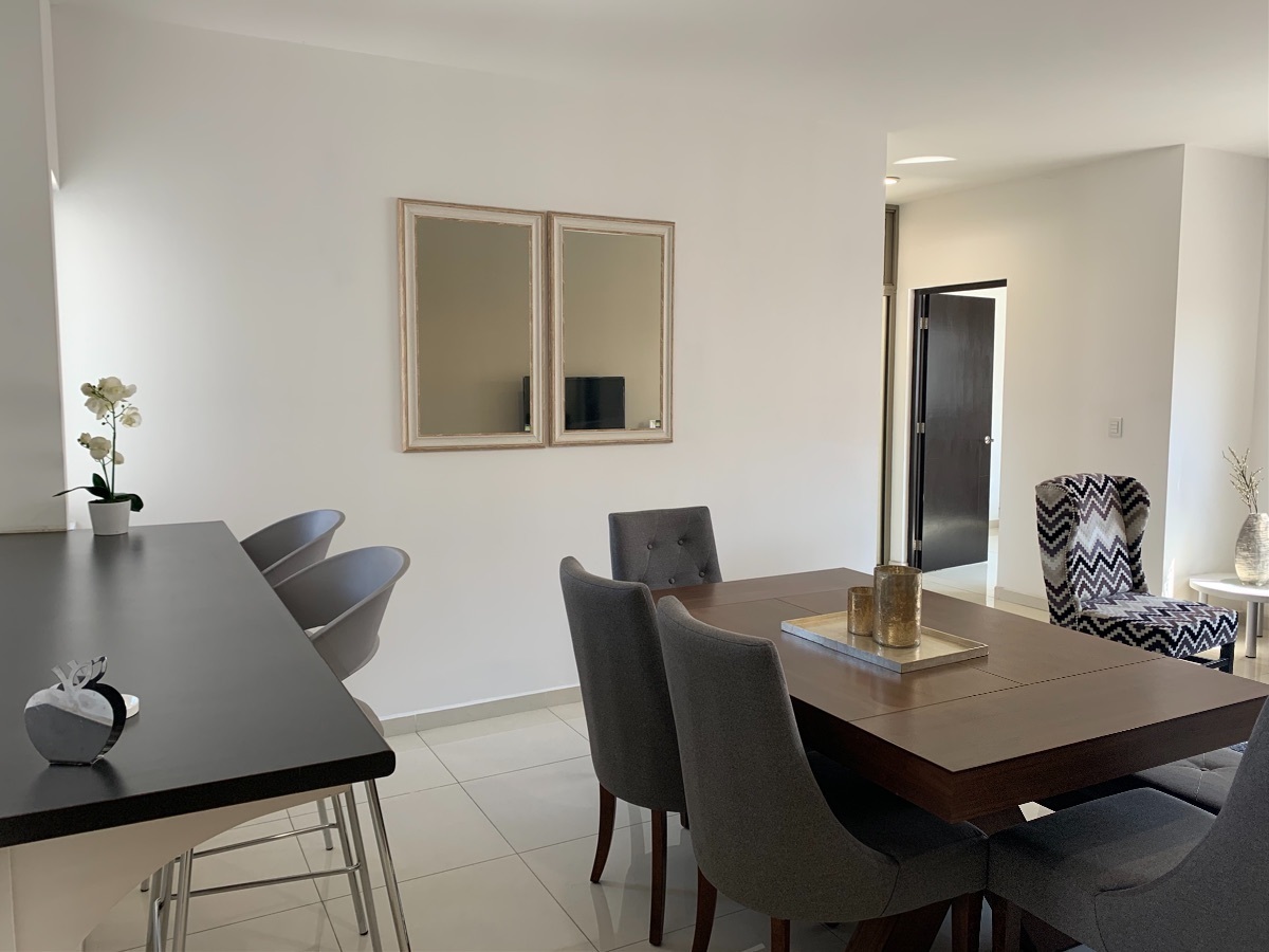 Hermoso departamento amueblado decorado y equipado en renta de 2 recamaras, cada una con su baño y closet, cocina semi abierta con desayunador, sala comedor, centro de lavado amplios e iluminados espacios.