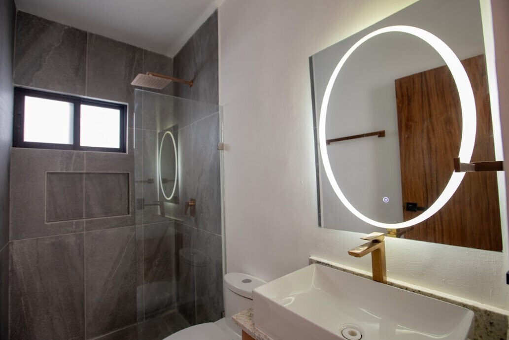 Se entrega equipado con ventiladores de techo, mini split , cocina con parrilla , horno de microondas y refrigerador.