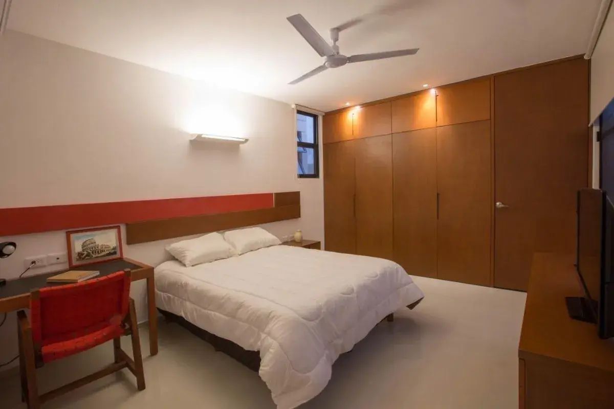 • 2 quartos com armários embutidos, ventiladores e ar-condicionado inverter, camas Queen size, Smart TV e mesas de trabalho.