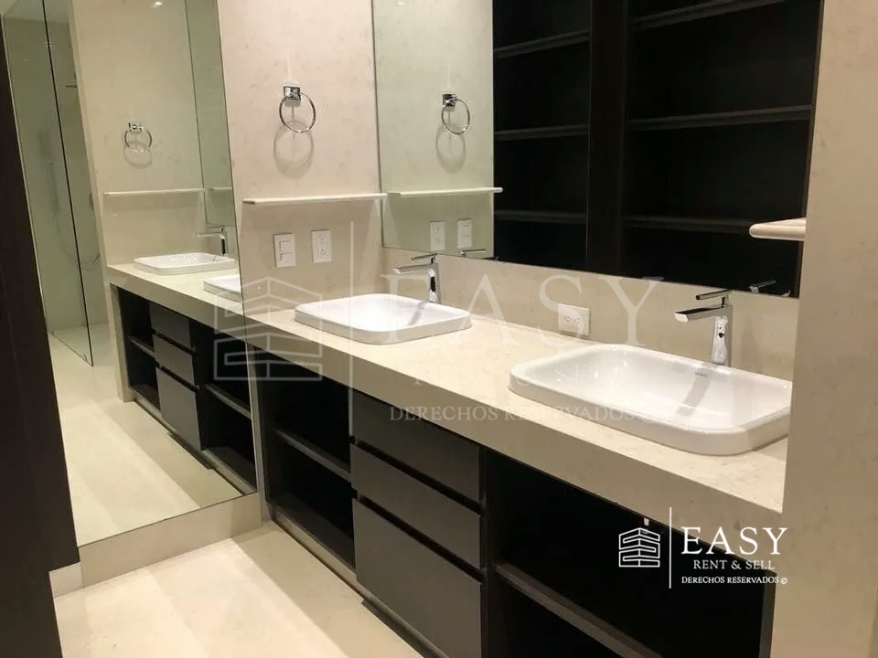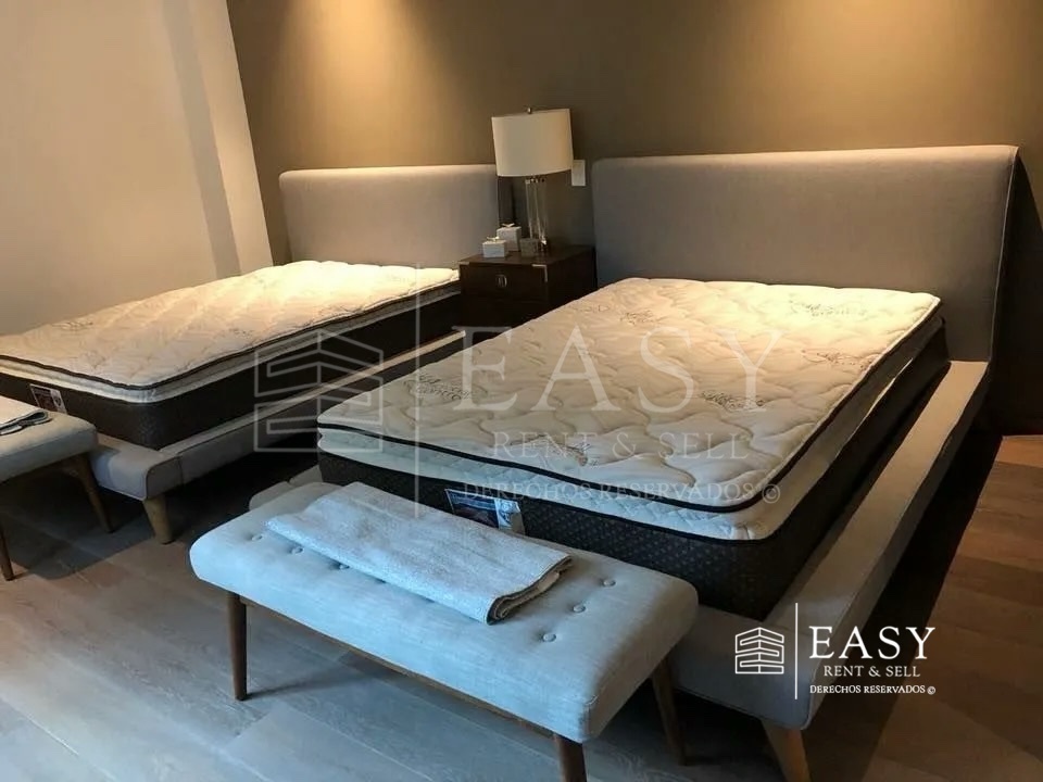 Cuenta con 2 recámaras, la principal tiene baño completo con tina, vestidor y balcón; la segunda recamara baño completo y closet; un baño de visitas completo, sala comedor, cocina integral equipada, cuarto de lavado, bodega, mantenimiento incluido. Gimnasio común, área de chóferes, site completo, vigilancia y elevador de autos.