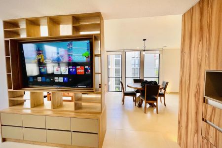 ÁREA DE TV, ONDE TAMBÉM PODE SER FEITO HOME OFFICE, HÁ UM SOFÁ-CAMA, ESCRITÓRIO, CADEIRA E TV (ESSA ÁREA PODE SER CONVERTIDA EM UM SEGUNDO QUARTO)