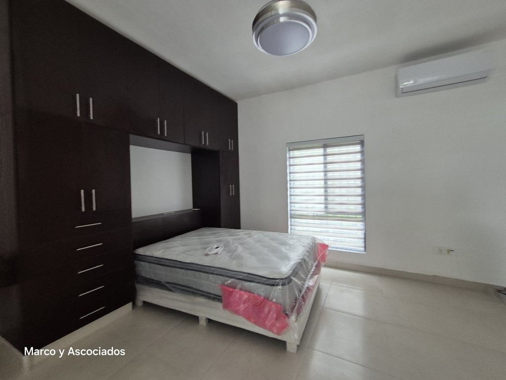 Área de recamara con su cama tipo matrimonial con un closet de pared ,cajoneras y maleteros y un escritorio empotrado .