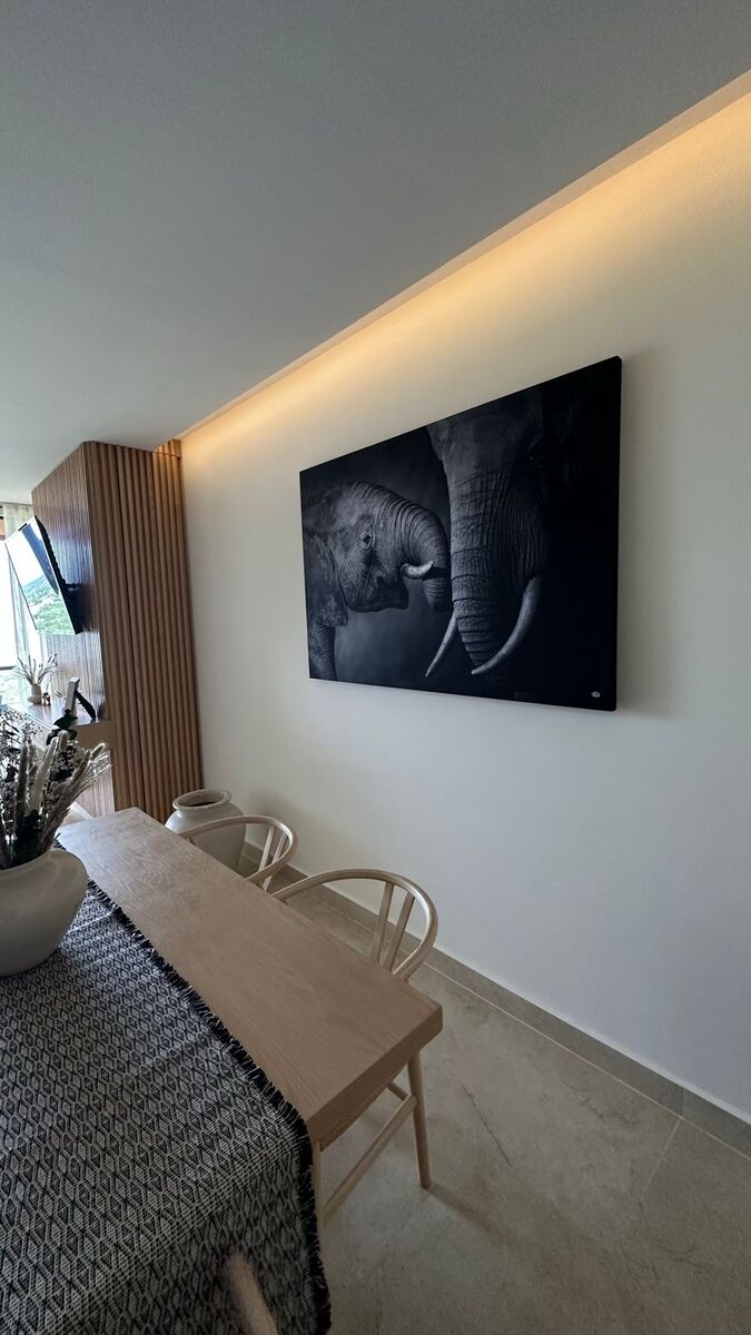 Sala con TV de 55”, comedor para 6 personas y cocina equipada