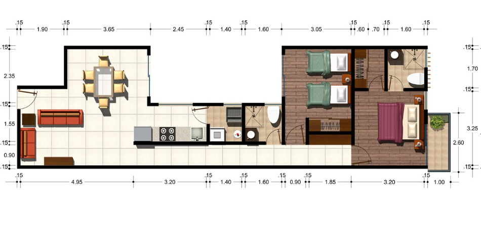 2 quartos, sendo o principal com closet, banheiro completo e varanda.