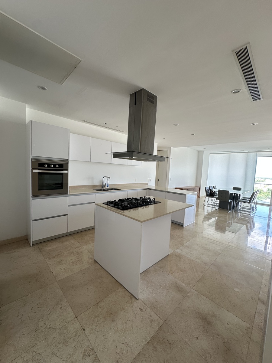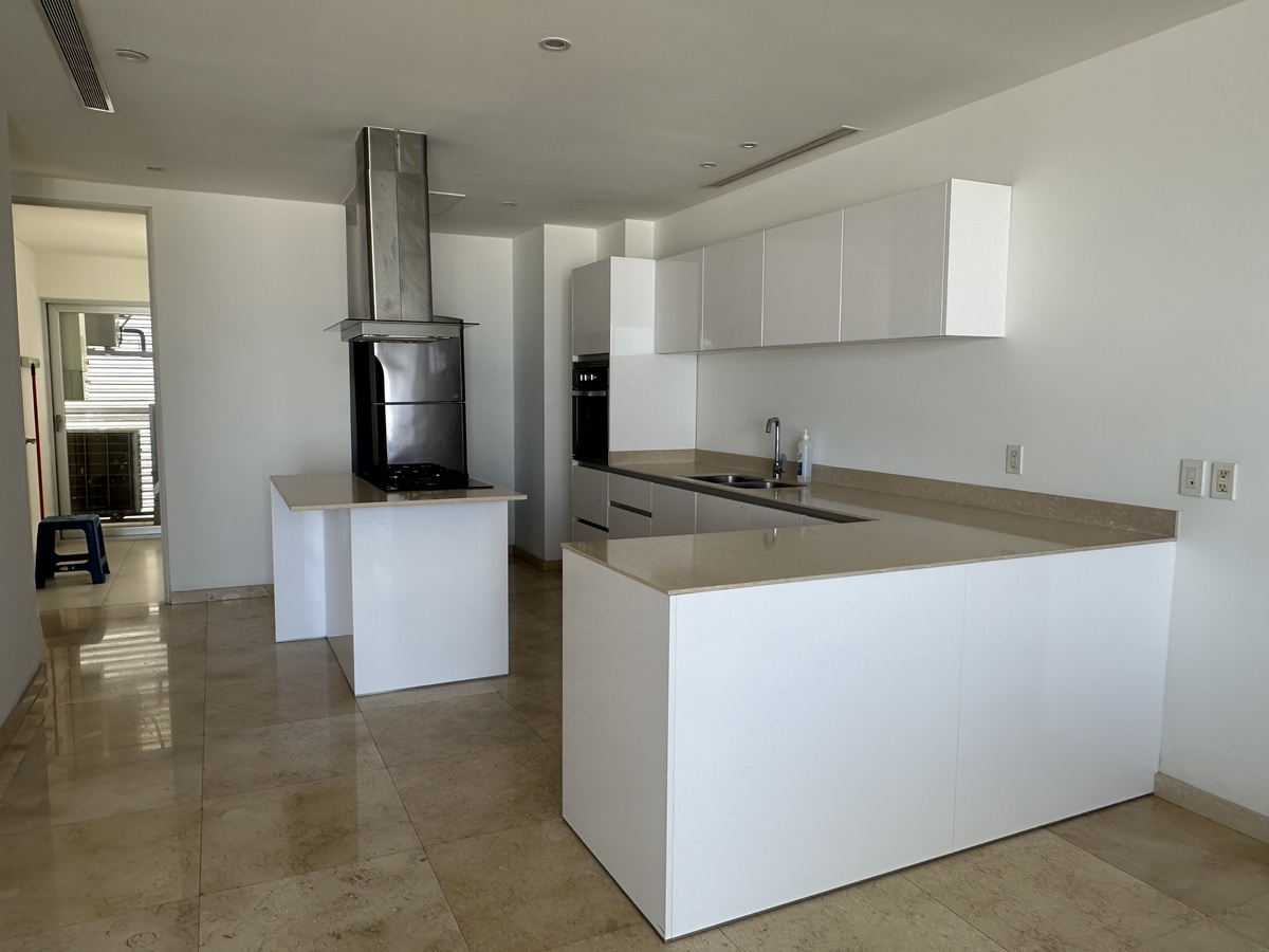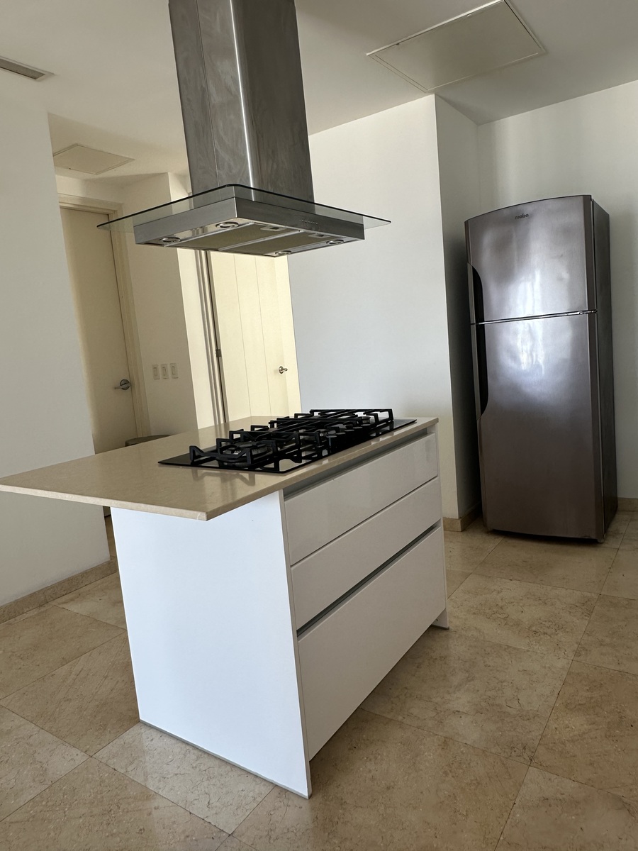 - Cocina integral con cubierta de cuarzo color blanco, equipada con horno de gas, parrilla de gas, campana de extracción, fregadero, y mezclador monomando.