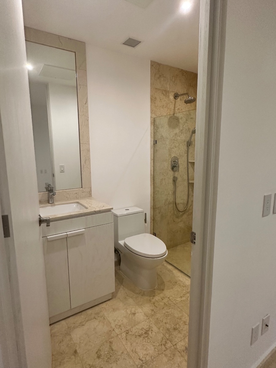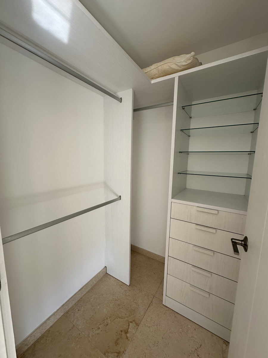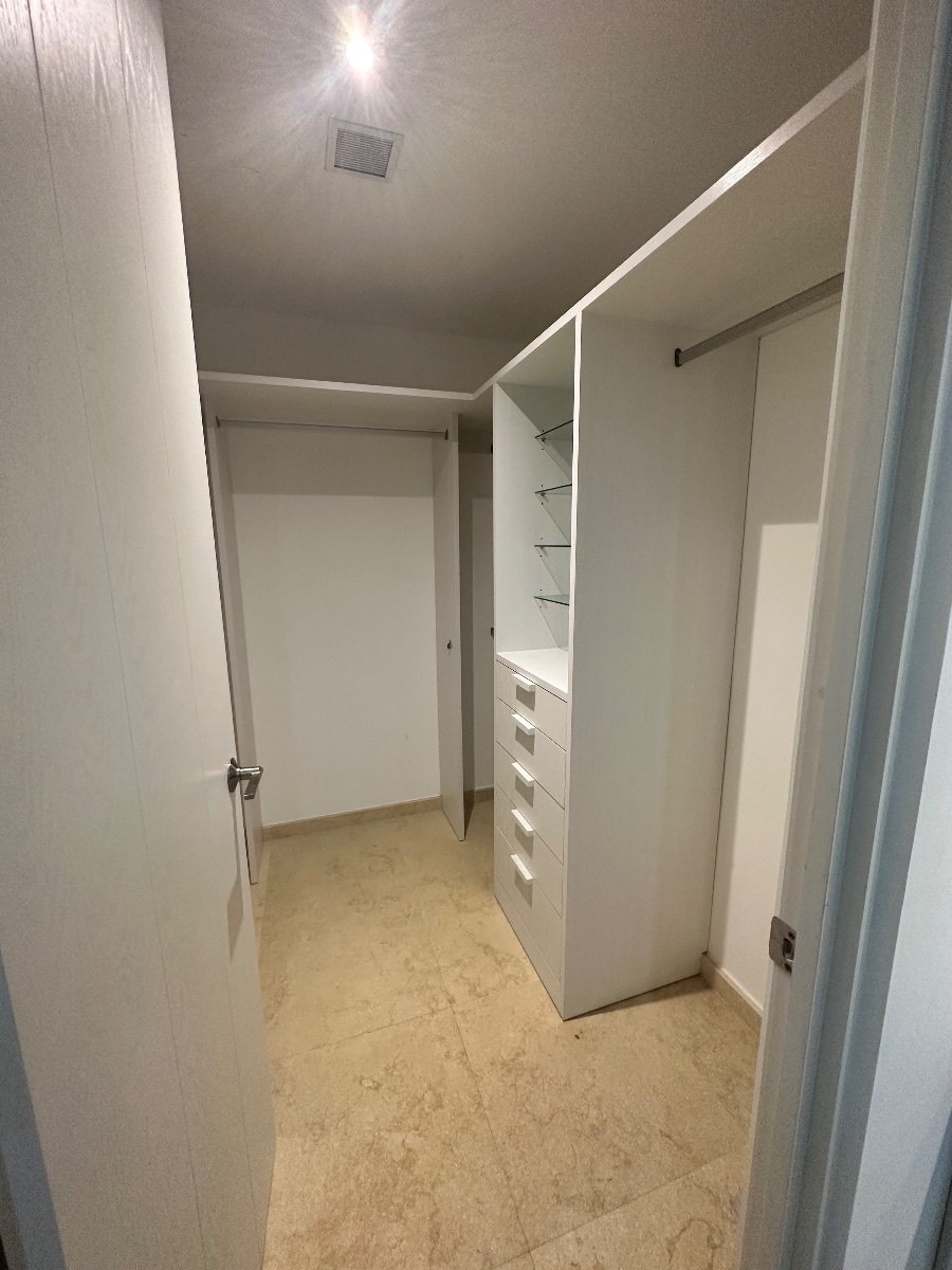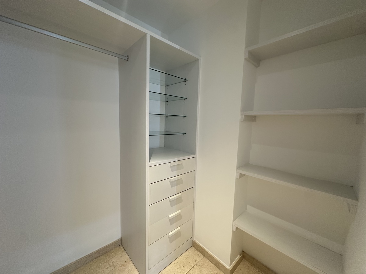 - Cocina integral con cubierta de cuarzo color blanco, equipada con horno de gas, parrilla de gas, campana de extracción, fregadero, y mezclador monomando.
