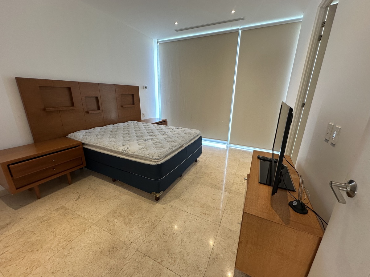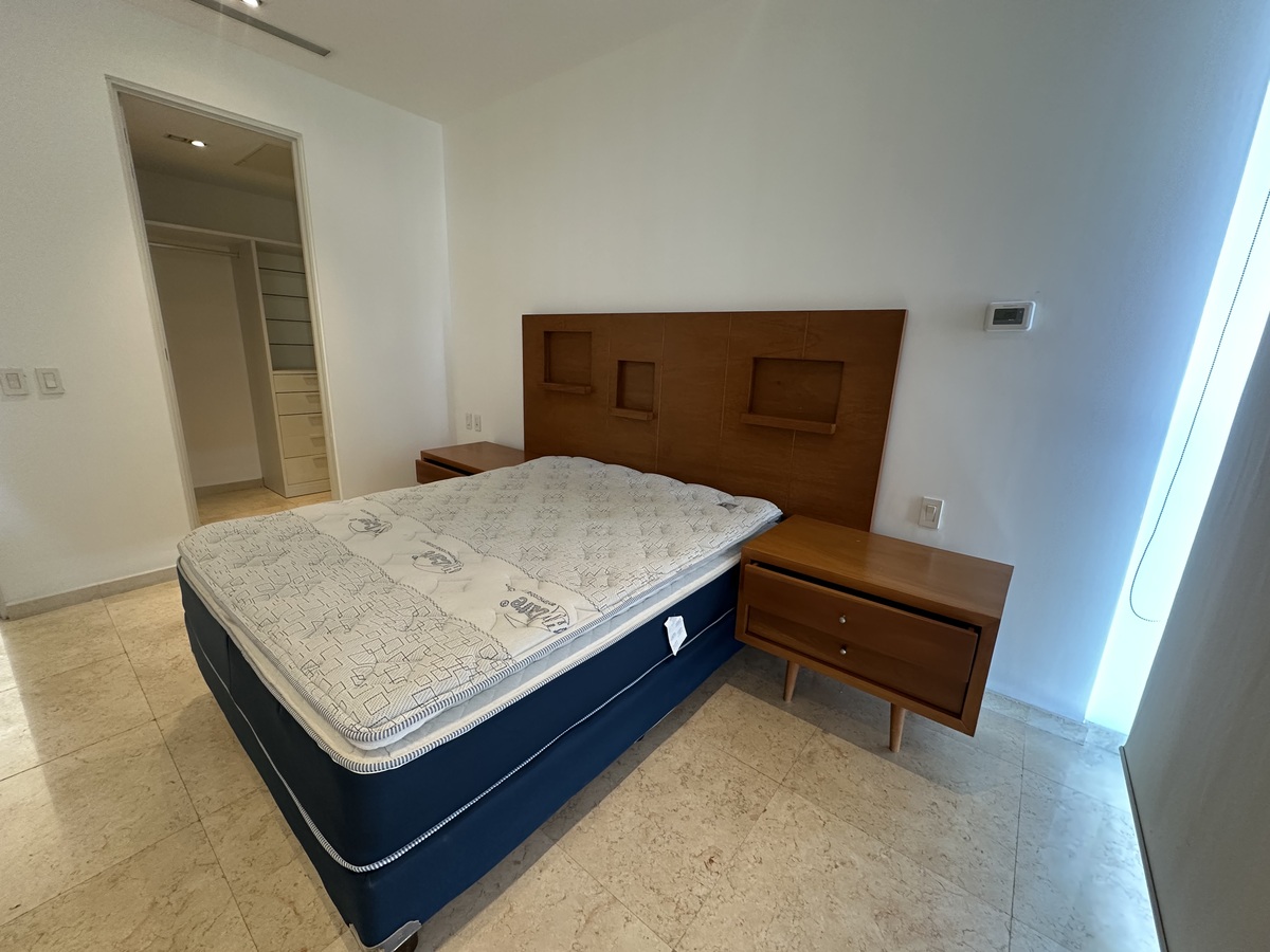 - Cama King Size con cabecera y burós de madera en recámara principal, mueble y TV