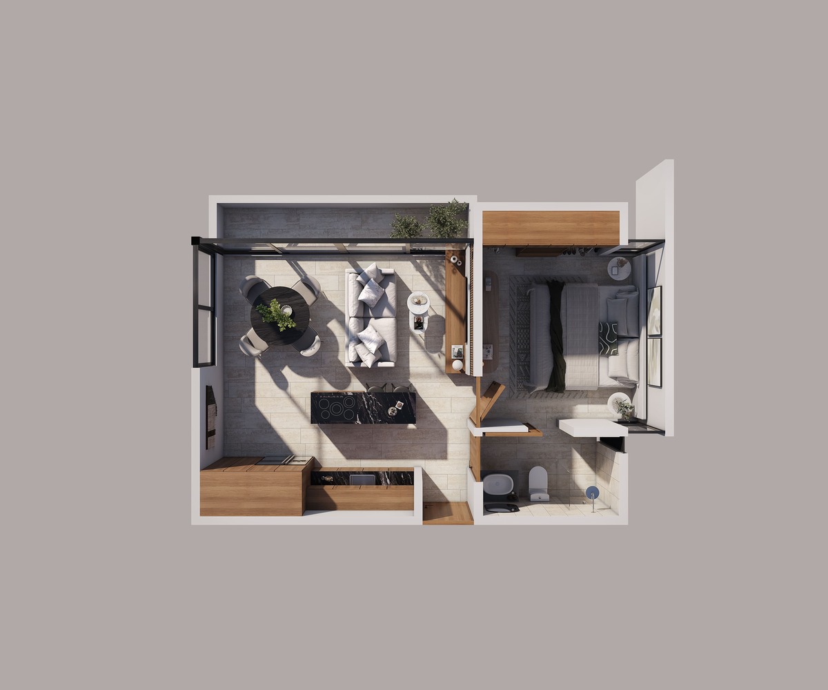 Apartamento de 1 quarto, em complexo com amenidades, MODELO A.Departamento de 1 recámara, en complejo con amenidades, MODELO A.