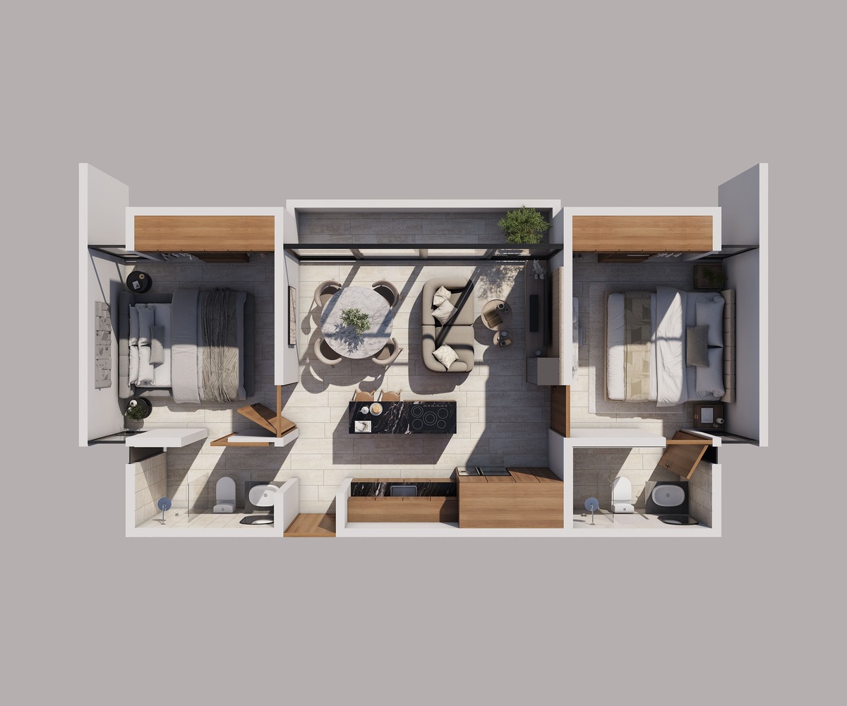 MODELO B/ 2 RECÁMARAS/ 60 MT2/ BALCÓN 4.50 MT2/ CAJÓN 12,50 MT2