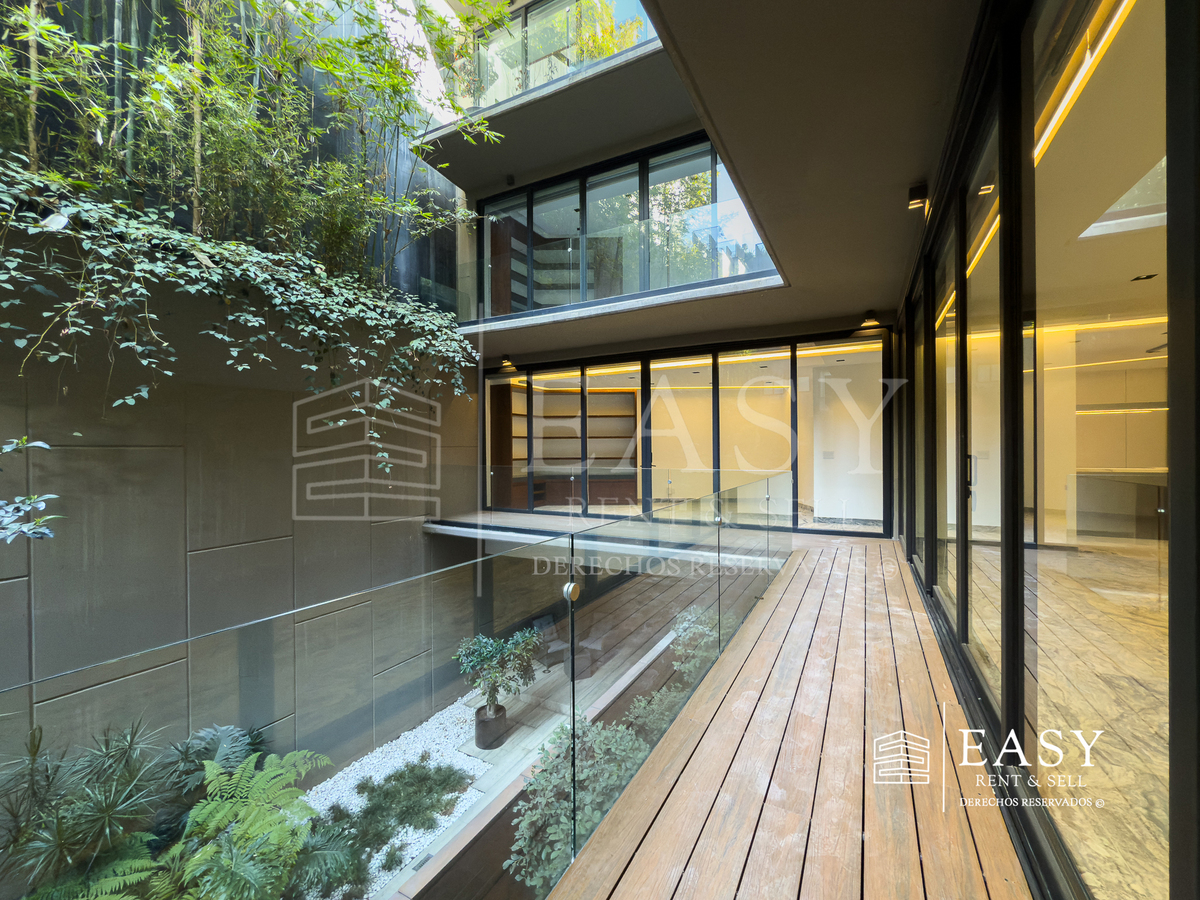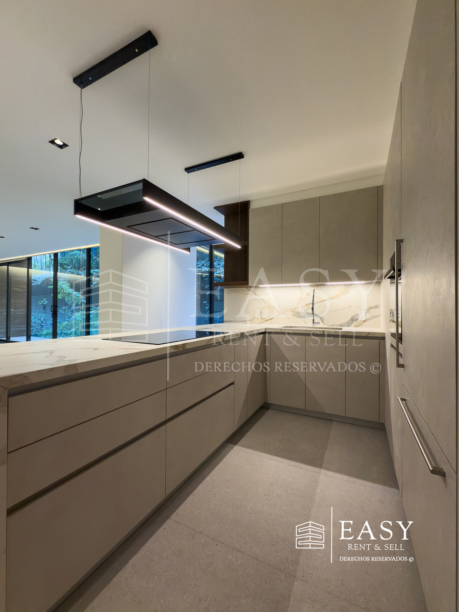 Cuenta con una amplia sala-comedor con detalles en madera y mármol, que se conecta a un balcón interior tranquilo. La cocina, equipada con tecnología de última generación, destaca por su estilo contemporáneo.