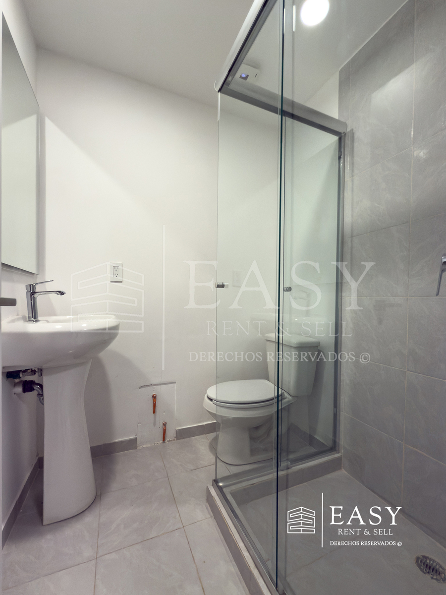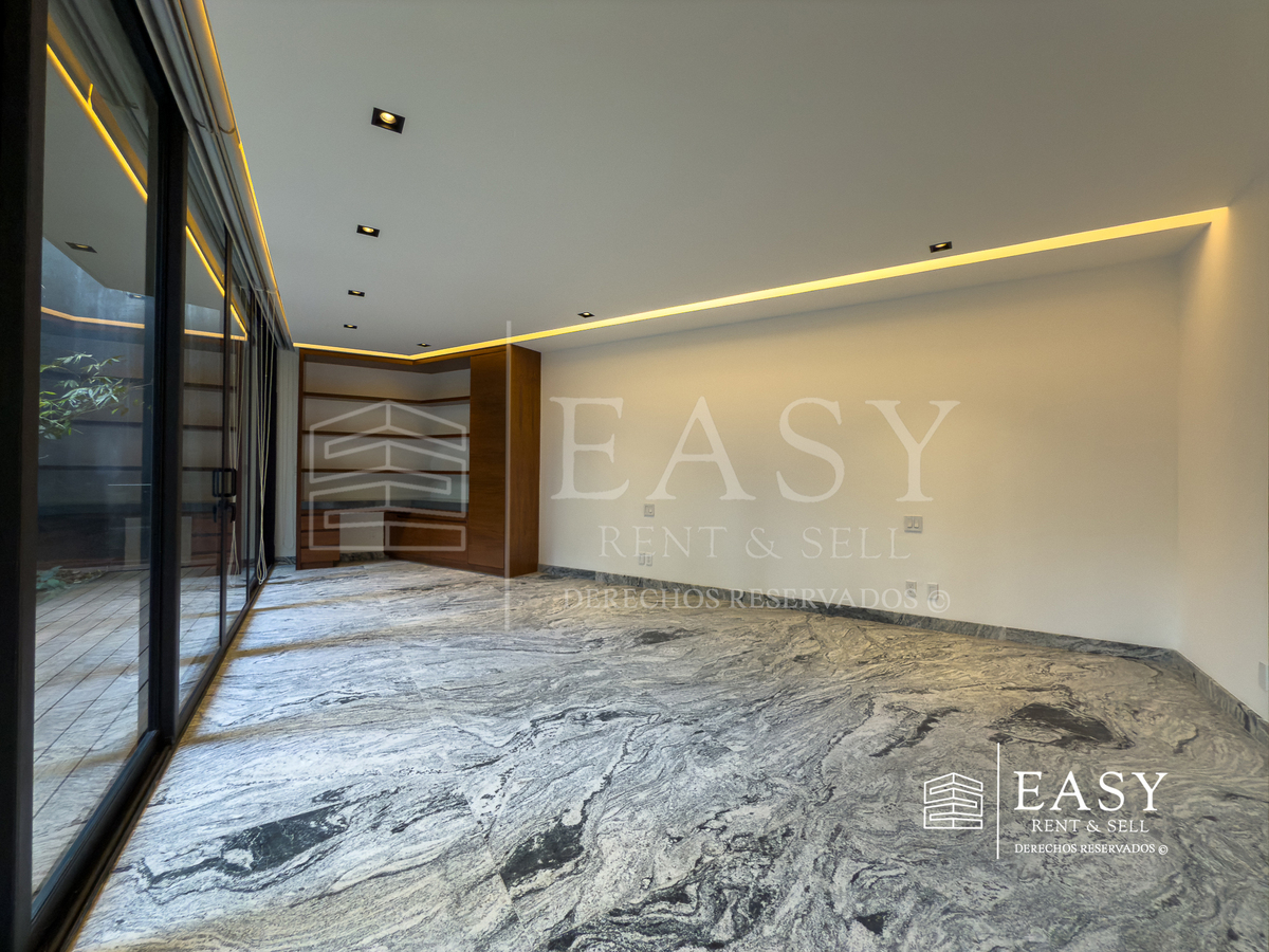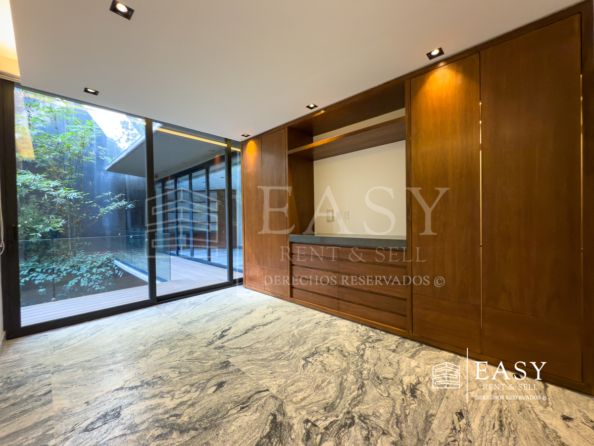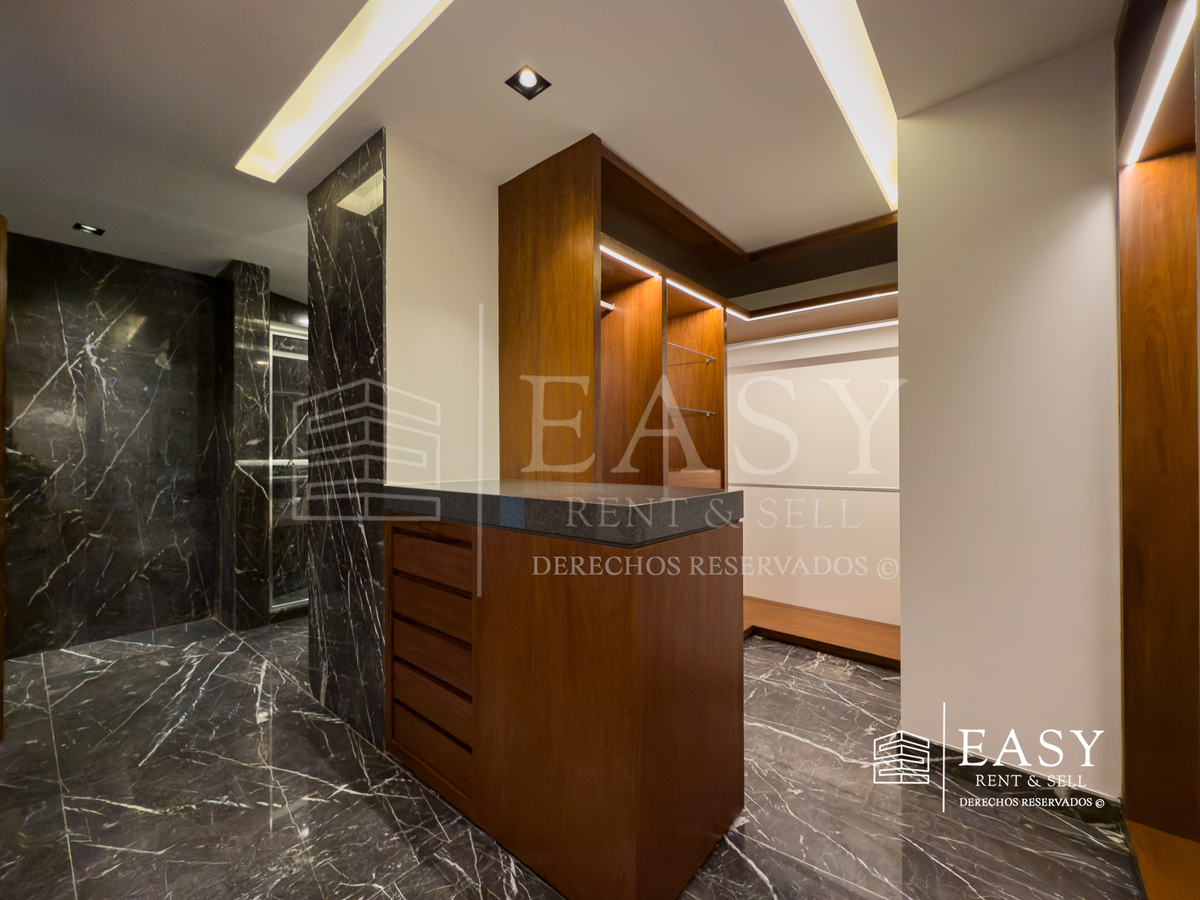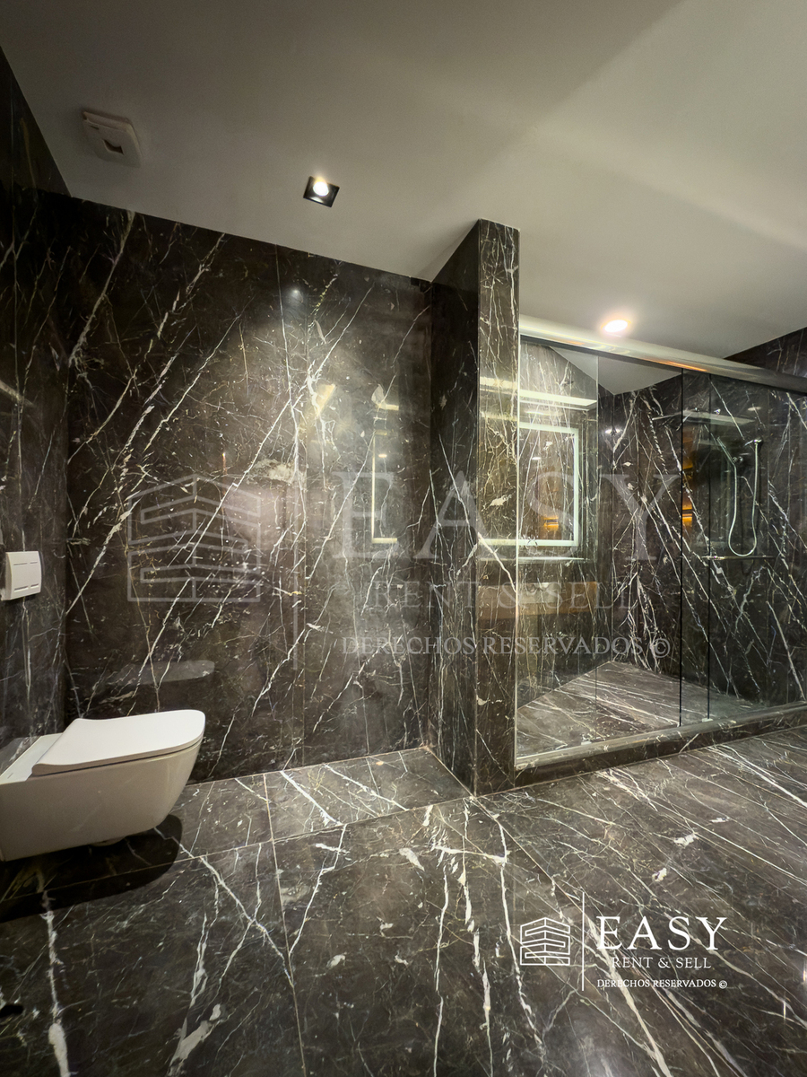 Dispone de 3 recámaras: la principal con walking closet y baño privado; las otras dos comparten un baño completo, ambos con elegantes acabados en mármol.