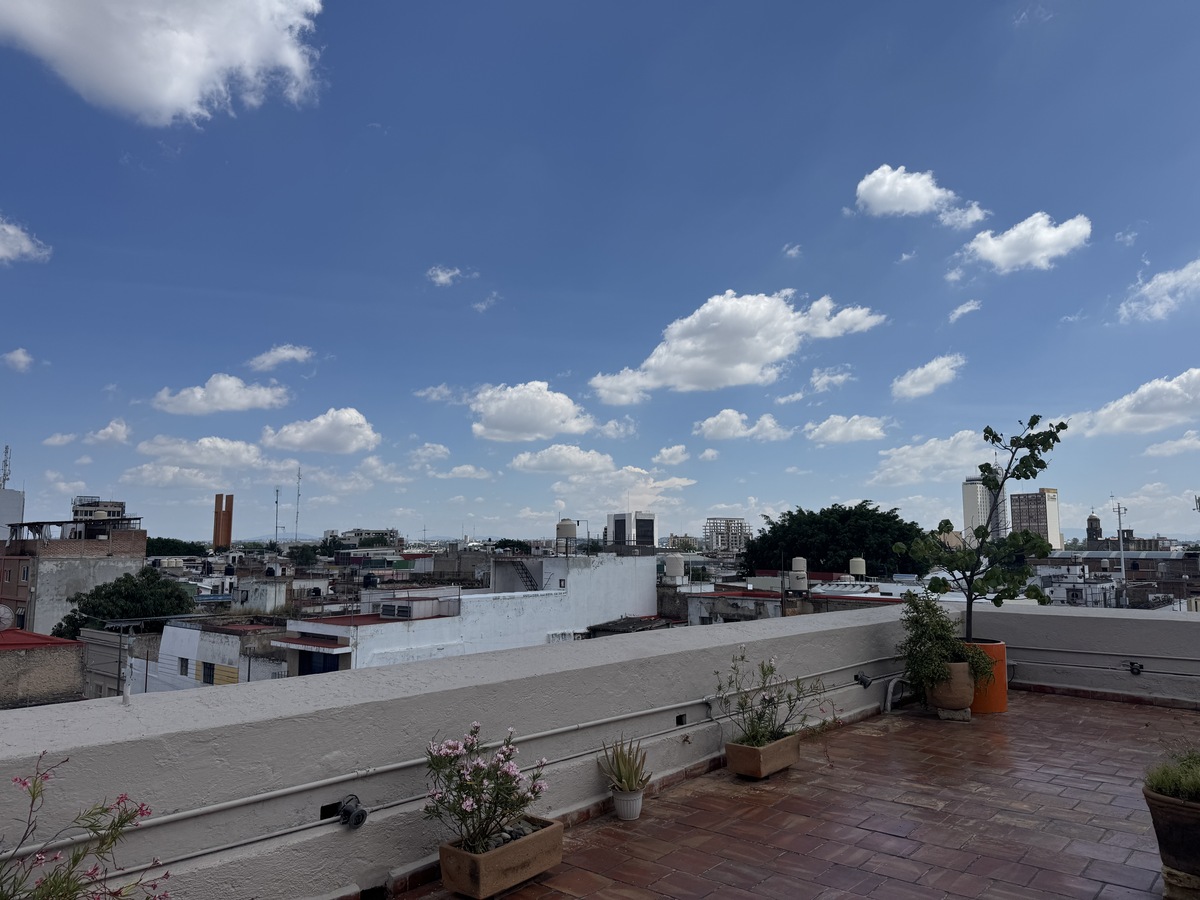 The colonial house also offers a shared rooftop garden, perfect for enjoying Guadalajara’s beautiful sky.