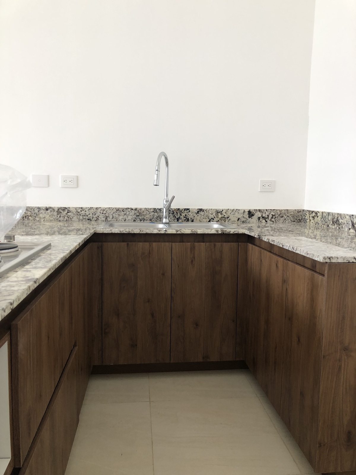 Cocina equipada con parrilla electrica, gavetas inferiores, barra de granito