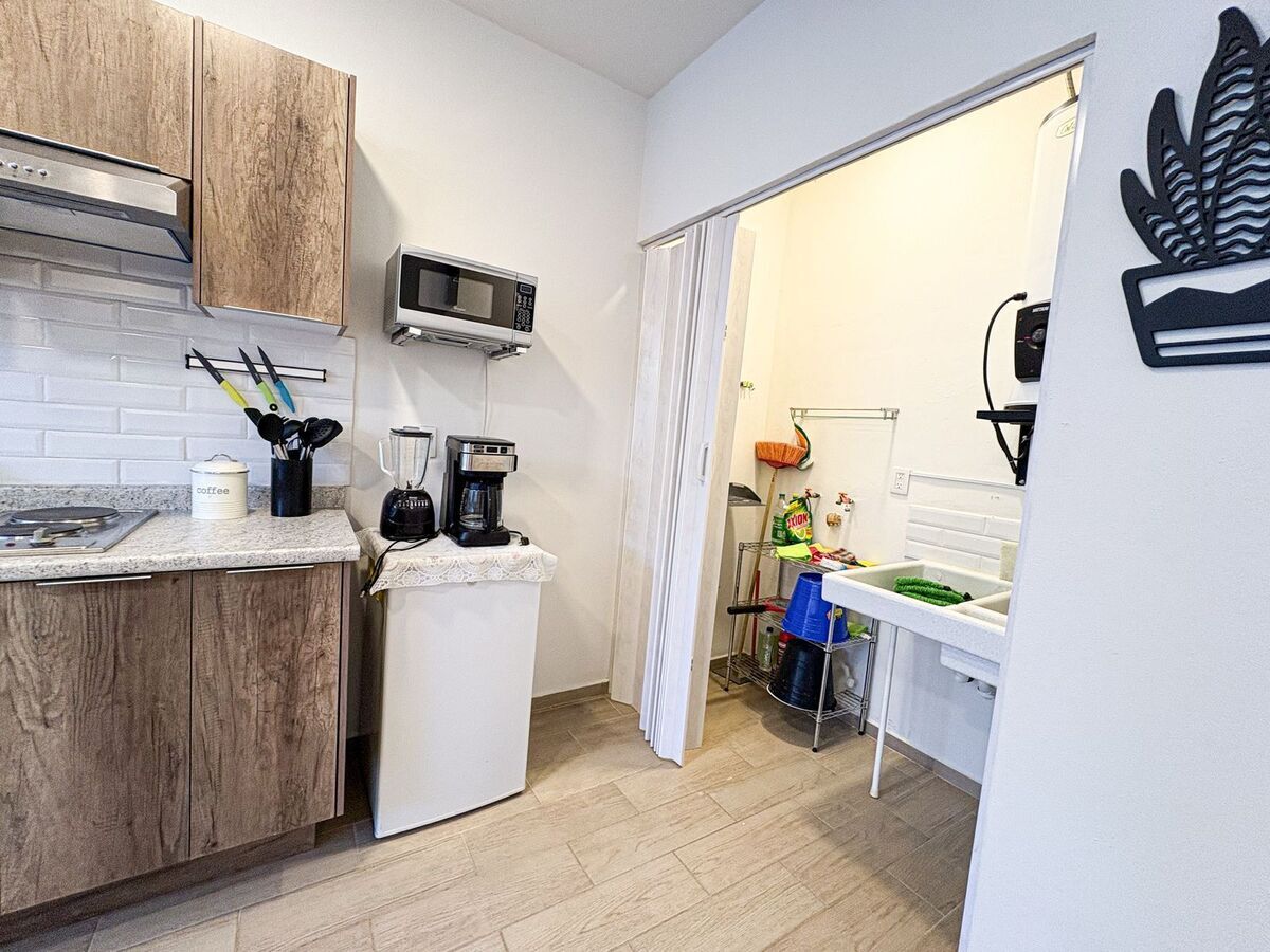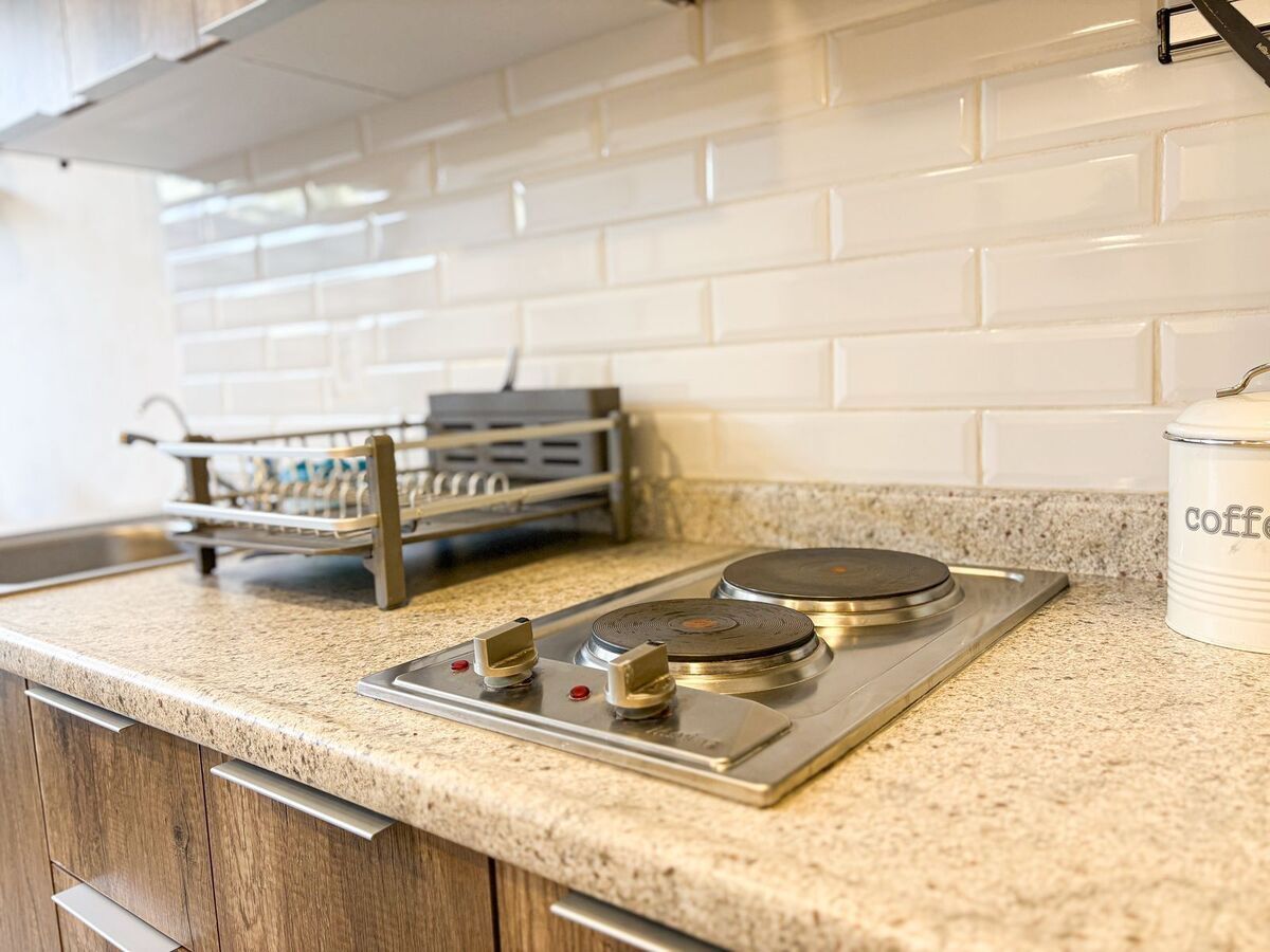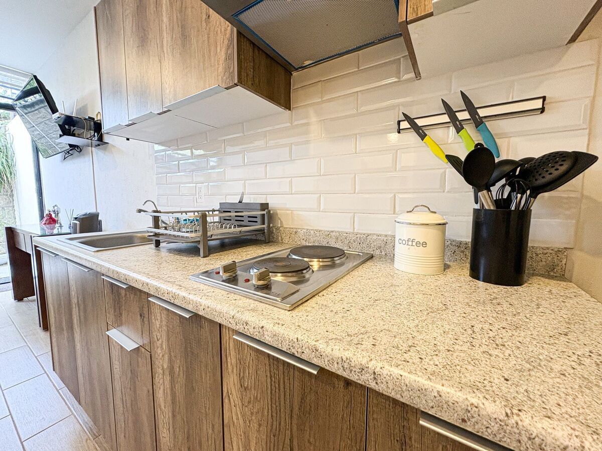 cocina integral con parrilla eléctrica, una pequeña terraza y un lugar de estacionamiento.