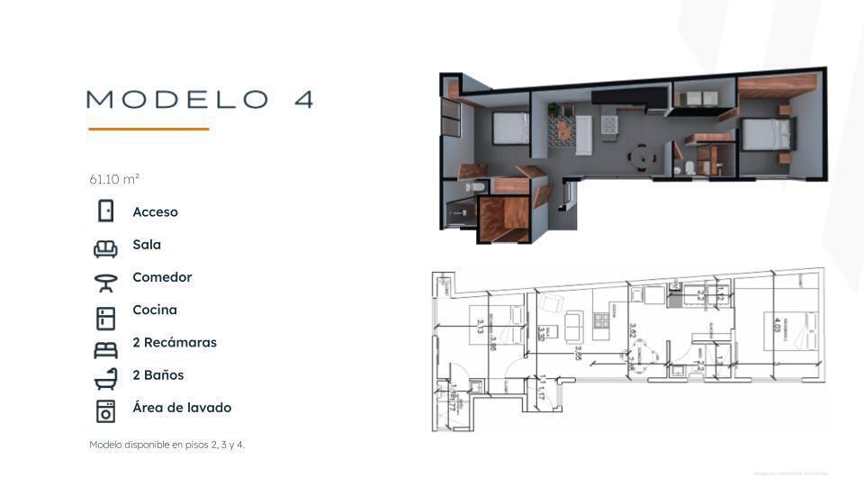 Torre de únicamente 16 departamentos todos cuentan con 2 recamaras 2 baños completos, cuarto de lavado cocina, sala y comedor. Contamos con 4 modelos que tienen las siguientes medidas 70 m2 más 20 m2 adicionales como jardín este modelo están ubicados en planta baja. Departamentos ubicados en pisos 1, 2, 3 y 4 cuentan con la medidas de 67.80 m2, 68.80 m2s y 60.50 m2. Se entregan totalmente terminados. Solamente 4 unidades por nivel, contamos con 12 lugares de estacionamiento en semi sótano. La torre contara con servicio de elevador desde el sótano hasta el 4to nivel, tendrá portón eléctrico e interfón.."