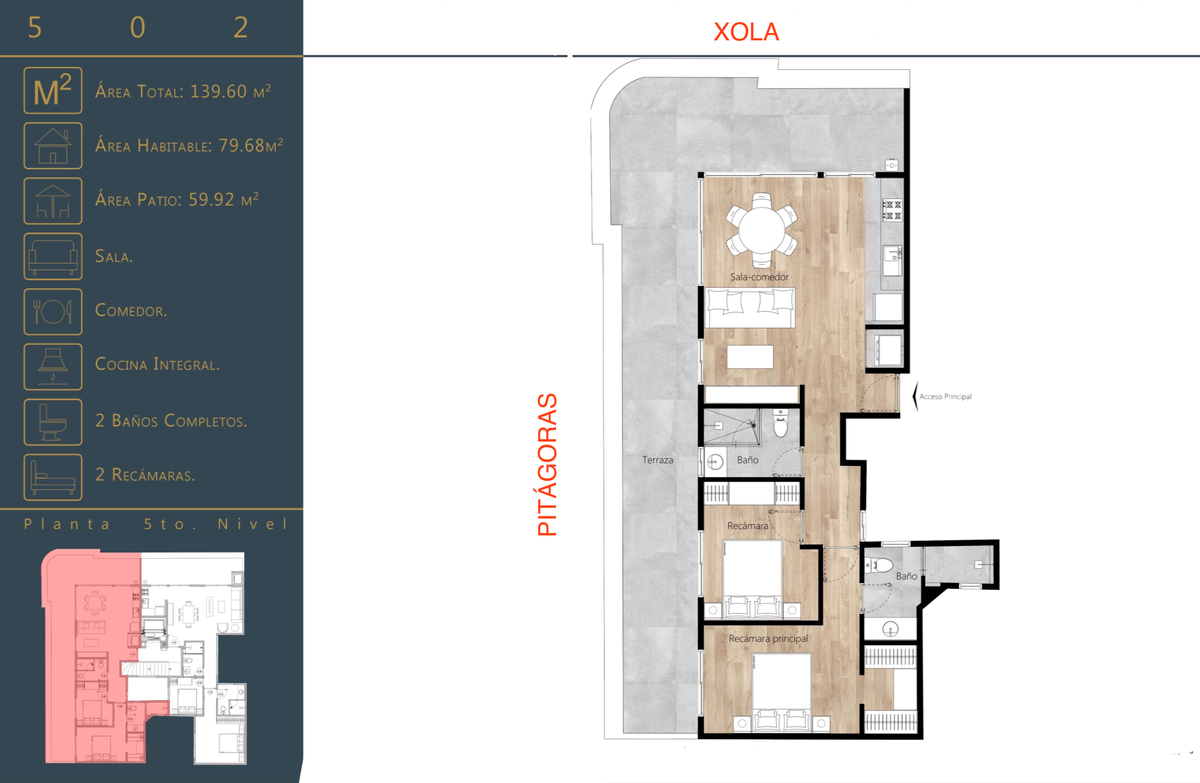 *Sup habitable: 79.68 m2 + 59.92 m2 de terraza = 139.6 m2 totales.
