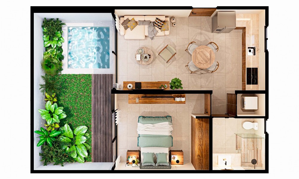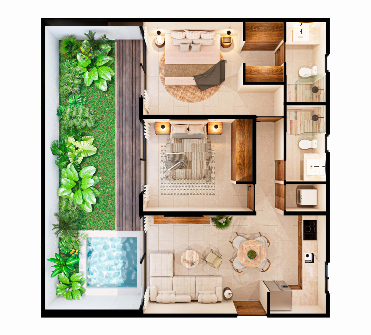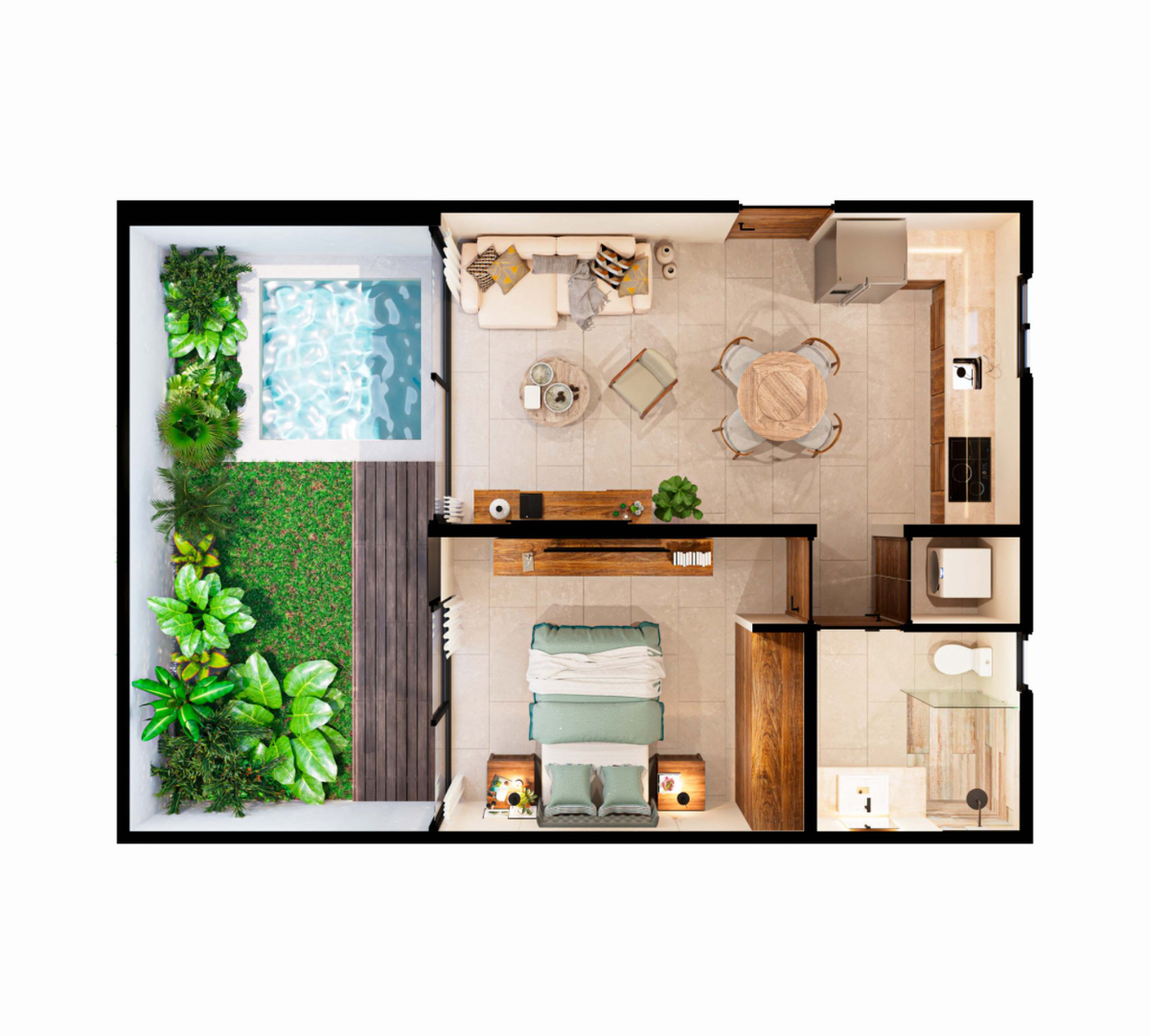 Este modelo se caracteriza por ser práctico y cómodo, ideal para parejas, profesionistas o inversionistas que buscan un espacio eficiente con alto valor de revalorización.