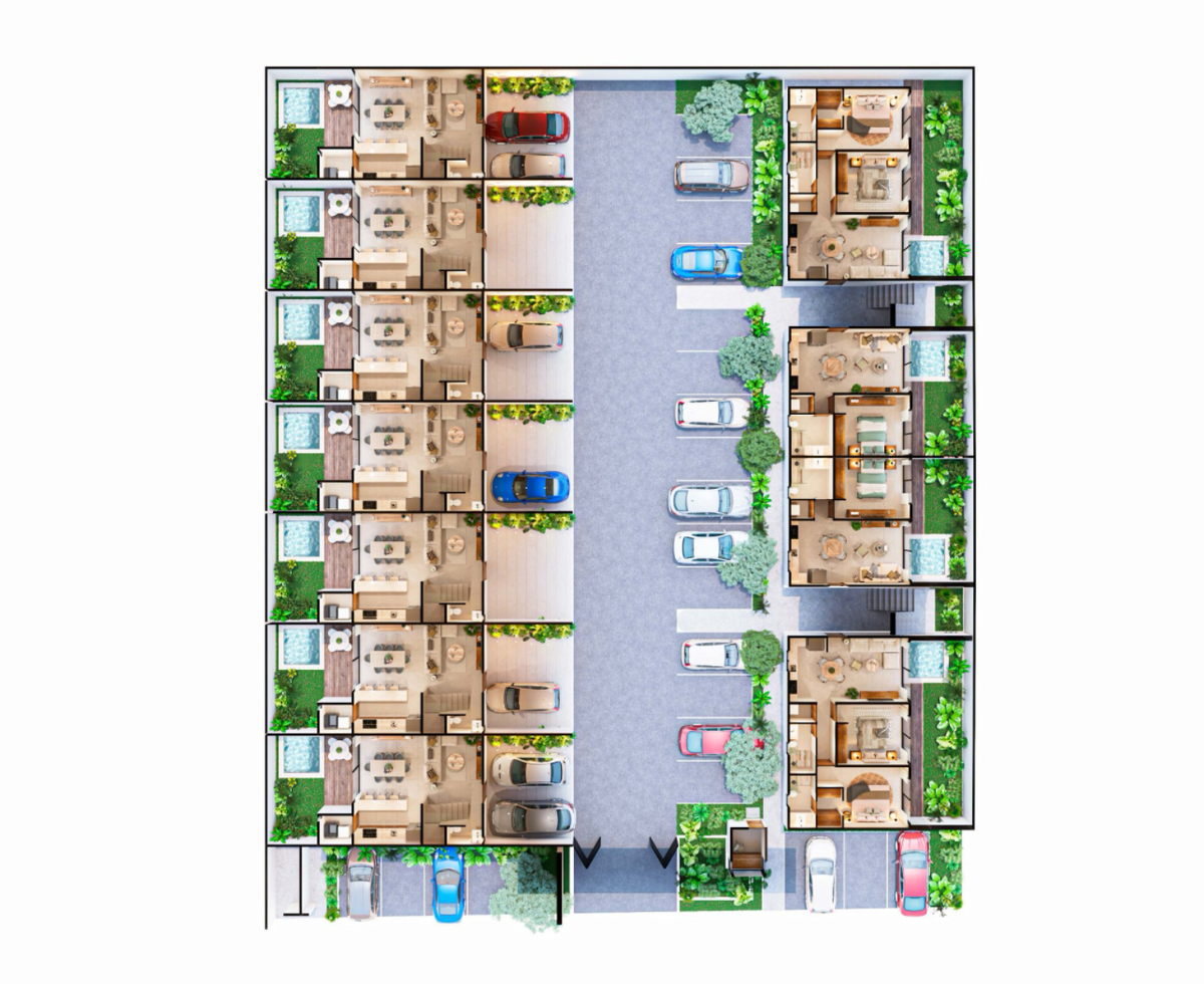 El desarrollo está conformado por 12 departamentos y 7 townhouses, diseñados con un estilo moderno y funcional, además de contar con amenidades como piscina y portón de acceso para mayor seguridad.