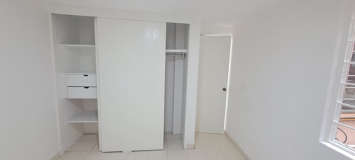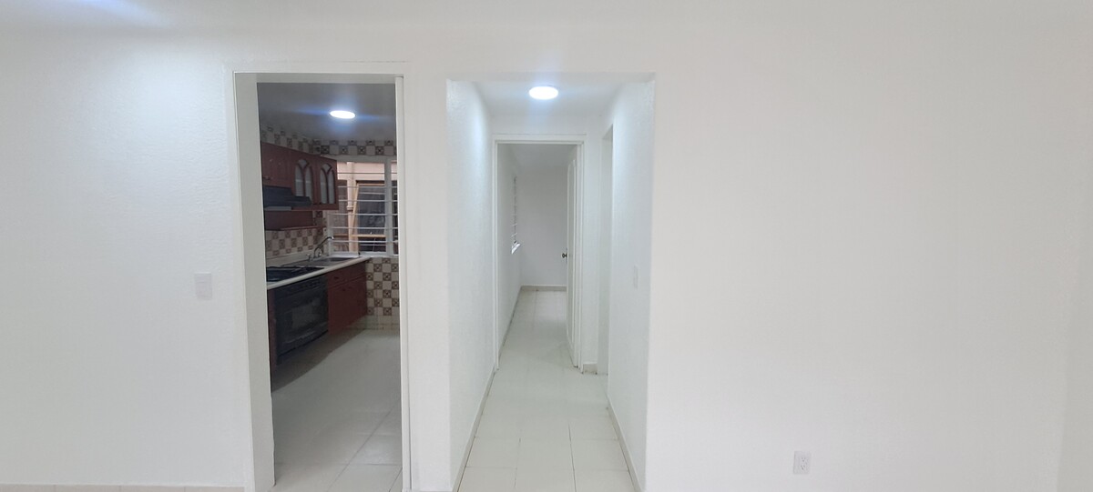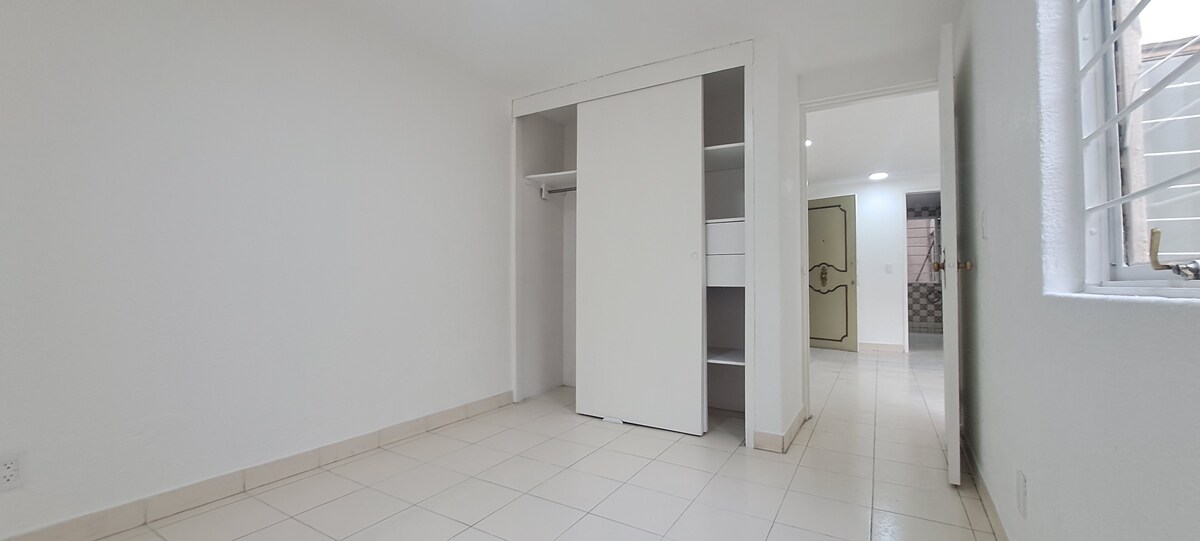 Ubicado en el primer piso, cuenta con una amplia estancia muy iluminada, cocina integral funcional, y dos recámaras con closets equipados con cajoneras y espacio para colgar ropa.