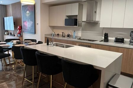Departamento de lujo para estrenar en torre exclusiva con gran ubicación en san pedro con acceso inmediato a los principales centros comerciales, autoservicios ,hospitales y colegios esta torre vanguardista e innovadora podrás encontrar en los primeros 3 niveles el área comercial , en donde se seleccionaron cuidadosamente los negocios para dar un ambiente confortable y satisfacer tus necesidades . el diseño del departamento cuenta con una espectacular vista que proporciona el ventanal de piso a techo en toda el área social y se integra armoniosamente sala , comedor y cocina logrando una distribución ideal para el aprovechamiento de espacios a tu medida que podrás disfrutar con familia y amigos , sin duda la altura de los techos te hará sentir una perfecta amplitud en todas las áreas del departamento y el balconcillo que ofrece el área social será un rincón que aprovecharas en tus reuniones . la cocina fabricada de madera precompuesta y cubierta de granito , equipada con parrilla eléctrica,horno,microondas y refrigerador de acero inoxidable . estancia familiar , 3 habitaciones con gran diseño y vista espectacular . recamara principal con balcón , walk in closet y baño completo , recámaras secundarias con ventanal cada una con baño y con closet de madera, piso de mármol puertas de madera de nogal ,canceles de cristal templado, vestidores área de amenidades en la azotea , área techada de asadores ,alberca, jacuzzi y camastros con vigilancia 24/7 equipamiento :parrilla, horno,campana,refrigerador,lavadora,secadora,espejos y clima. 9y capital tu socio de bienes raíces.