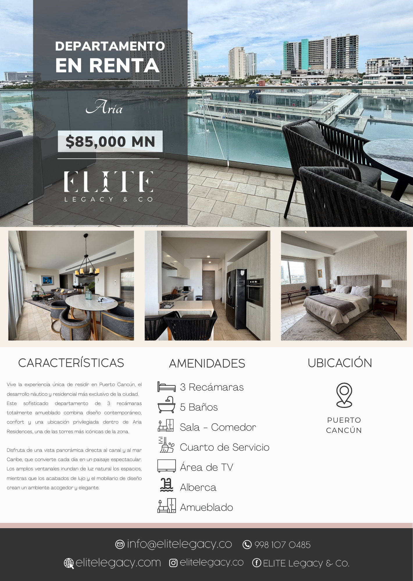 Este sofisticado departamento de 3 recámaras totalmente amueblado combina diseño contemporáneo, confort y una ubicación privilegiada dentro de Aria Residences, una de las torres más icónicas de la zona.