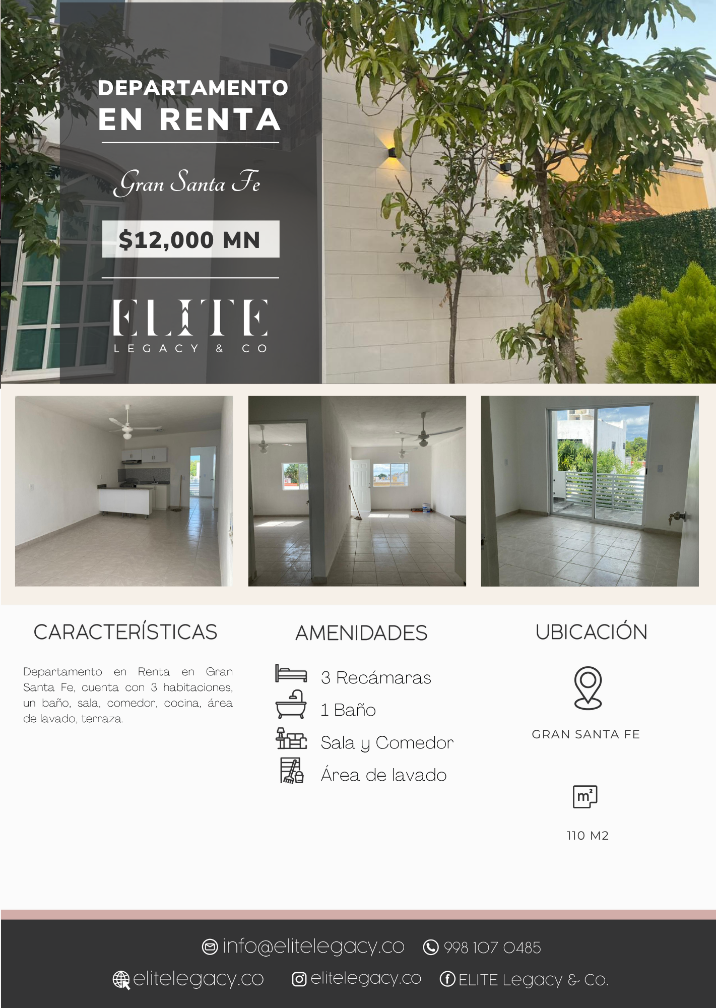 Departamento en Renta en gran santa fe, cuenta con 3 habitaciones, un baño, sala, comedor, cocina, area de lavado, terraza.