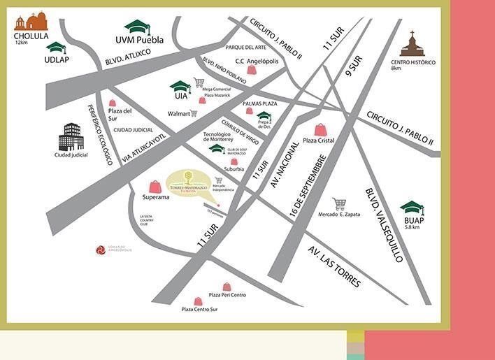 Cerca de avenidas importantes: periférico, Atlixcáyotl, 11 sur, av. Las torres a 7 min de Angelópolis, Terrapuerto, centros comerciales, farmacias y bancos. Cerca de la Ibero y Tec de Monterrey.