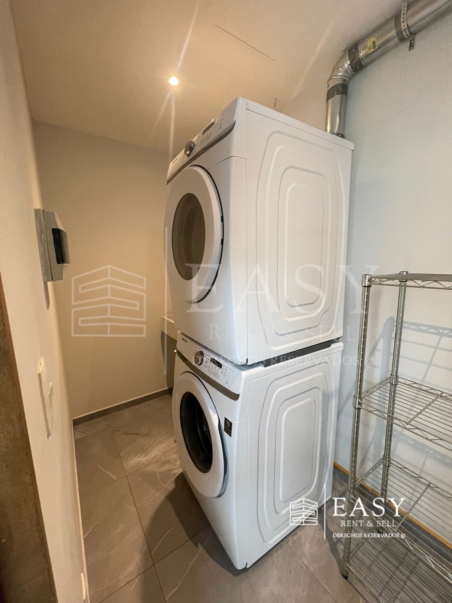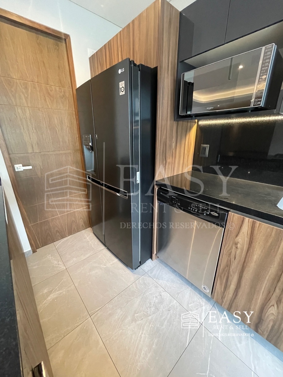 • Cocina abierta con electrodomésticos integrados (Refrigerador, lavavajillas, horno de microondas, lavadora y secadora) y acabados modernos