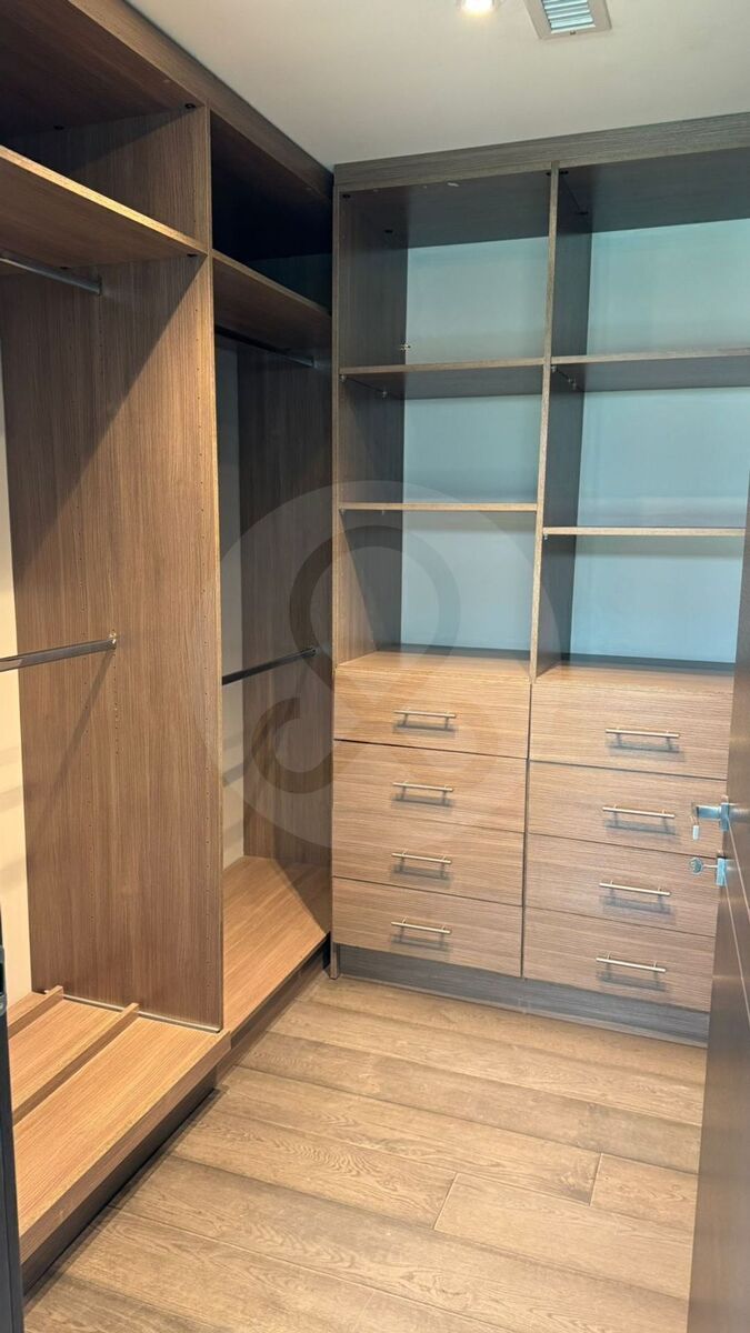 285m2, 3 quartos, cada um com closet e banheiro completo, 3,5 banheiros, escritório ou sala de TV, Sala de Estar/Jantar, cozinha integrada ampla com espaço para área de café da manhã, 3 vagas de estacionamento, despensa, área de lavanderia, quarto de serviço completo no andar térreo com jardim.
