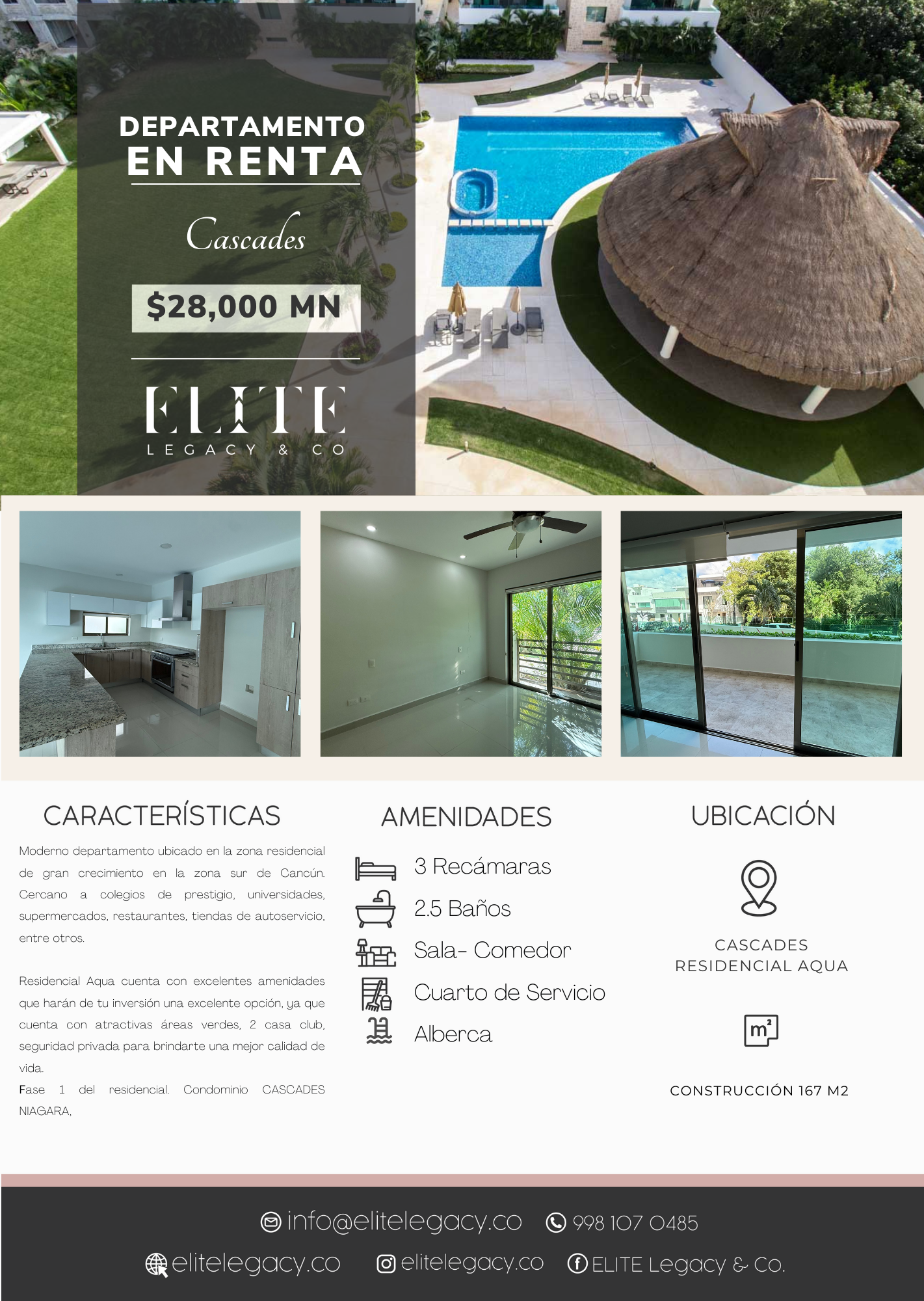 Esta propiedad se ubica en la fase 1 del residencial. Condominio CASCADES, Cuenta con 3 habitaciones, 2 lugares de estacionamiento subterráneo, en áreas comunes cuenta con amplio jardín con alberca, palapa, asador, camastros, adicional a las casas club de Residencial Aqua.