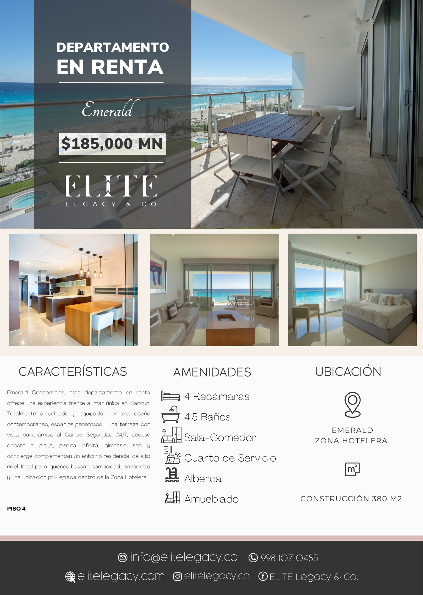 Segurança 24/7.Emerald Condominios, este departamento en renta ofrece una experiencia frente al mar única en Cancún. Totalmente amueblado y equipado, combina diseño contemporáneo, espacios generosos y una terraza con vista panorámica al Caribe. Seguridad 24/7, acceso directo a playa, piscina infinita, gimnasio, spa y concierge complementan un entorno residencial de alto nivel. Ideal para quienes buscan comodidad, privacidad y una ubicación privilegiada dentro de la Zona Hotelera.