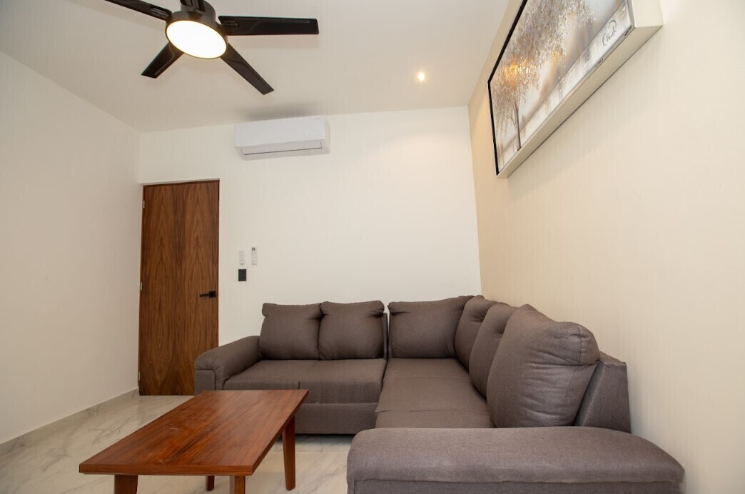 Se entrega equipado con ventiladores de techo, mini split , cocina con parrilla , horno de microondas y refrigerador.