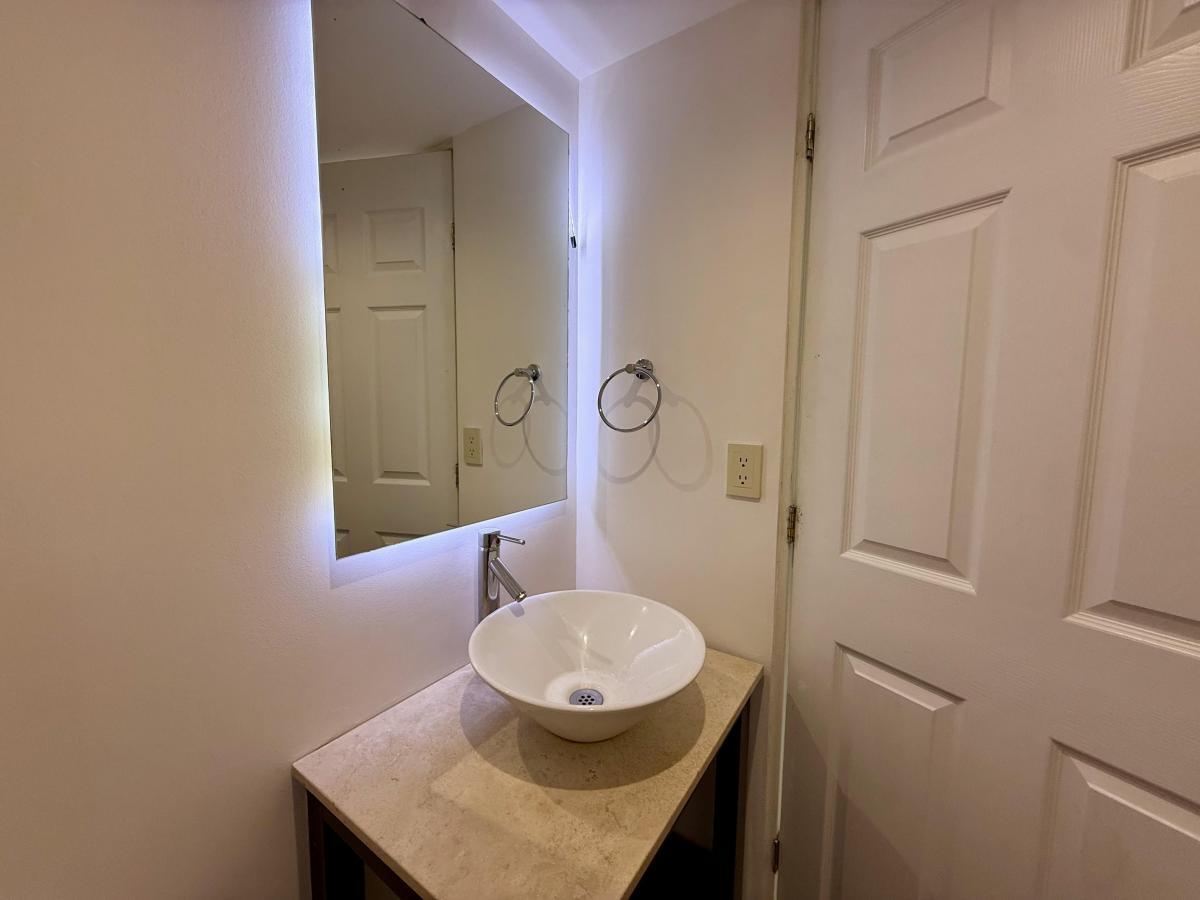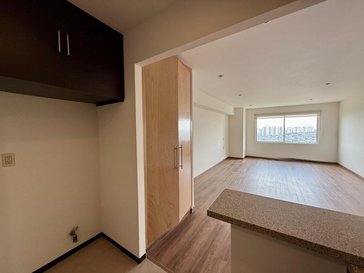 La estancia integra sala, comedor, baño de visitas y cocina abierta con cubierta de granito, barra, alacena y amplio espacio de guardado.