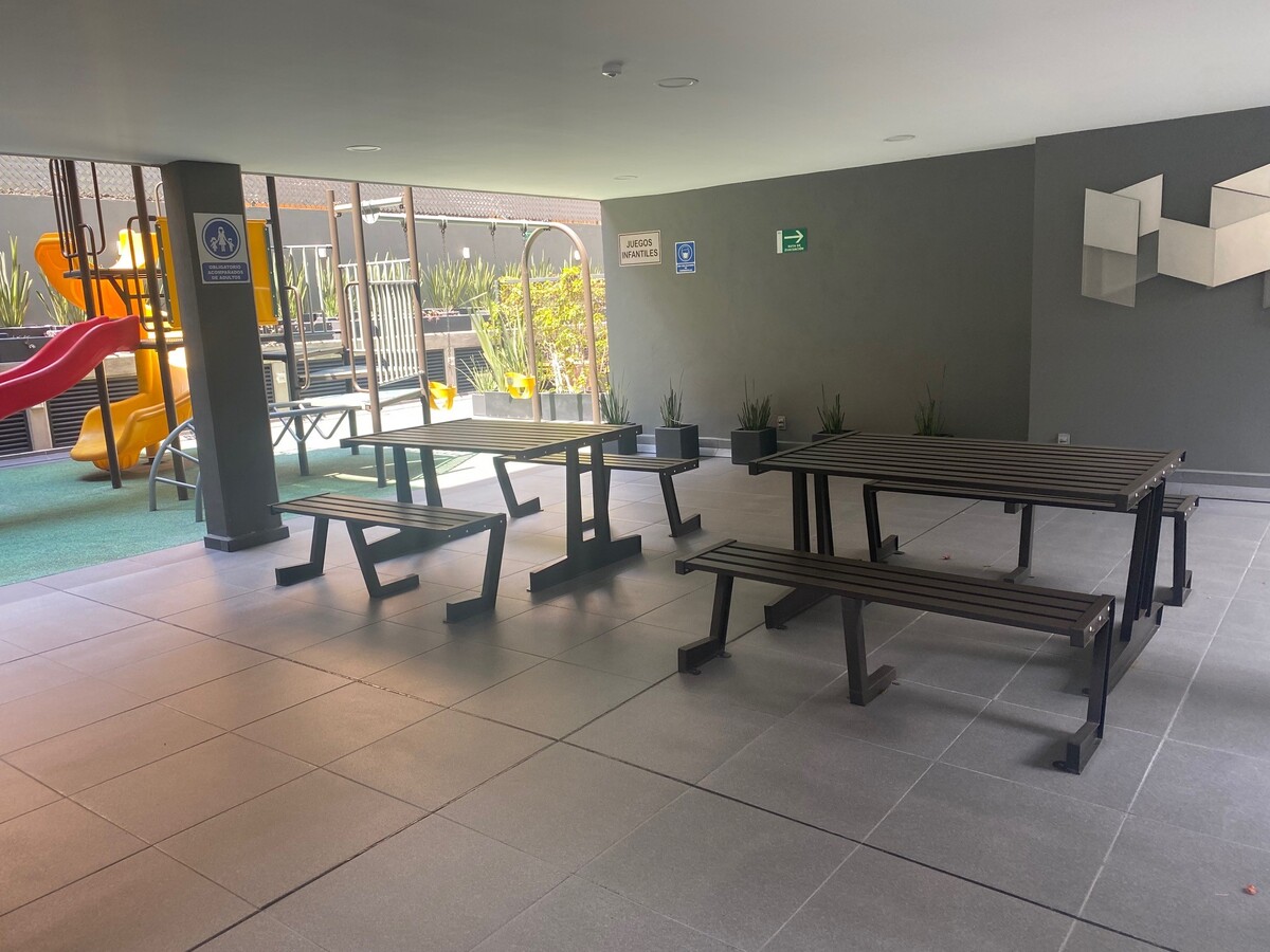 Este departamento incluye 1 lugar de estacionamiento. Además, el edificio cuenta con caseta de guardia y seguridad privada para tu tranquilidad. Se admiten mascotas, así que tu compañero peludo es bienvenido.