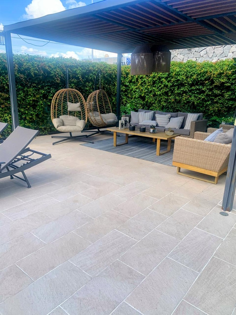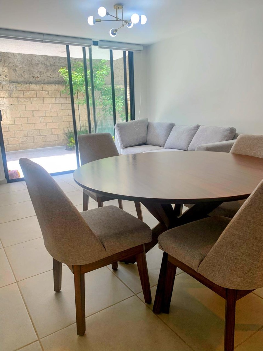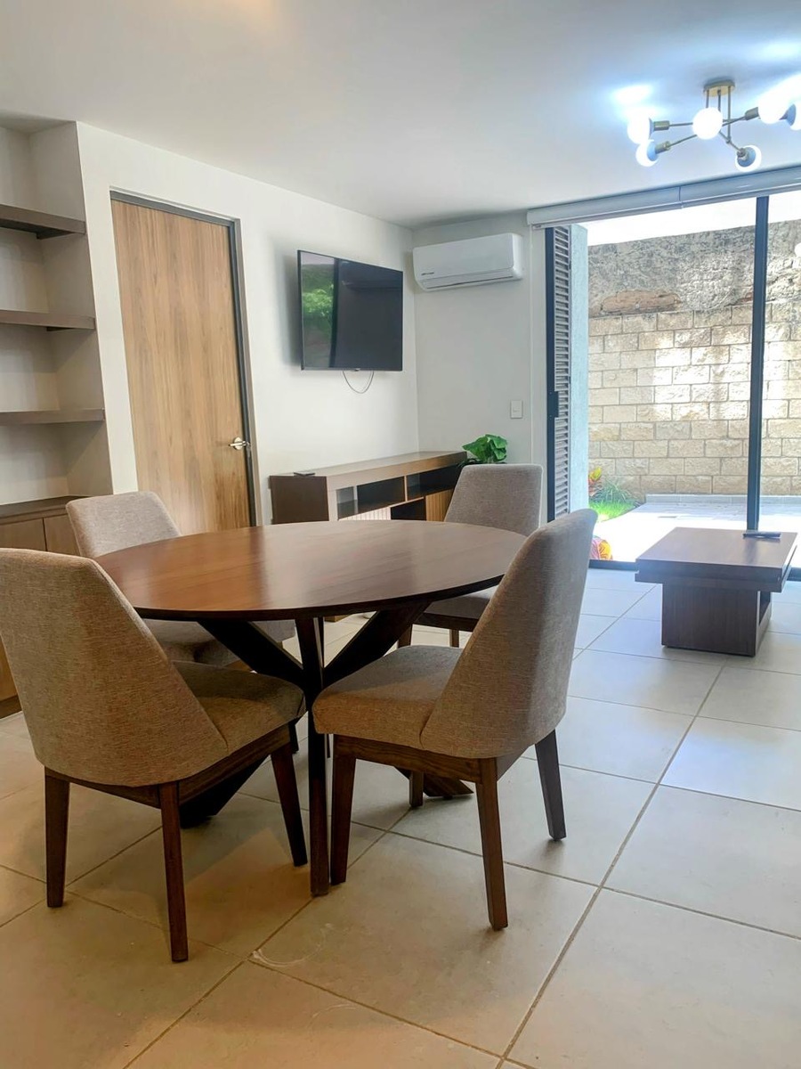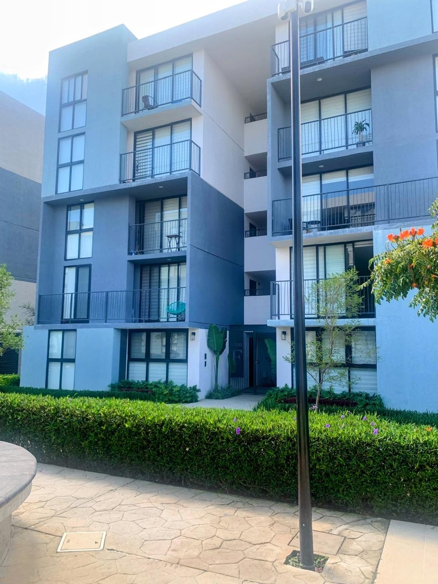El departamento cuenta con 109 m² y se encuentra en planta baja. Distribuido en sala, comedor, cocina integral equipada, área de lavado, dos recámaras (la principal con baño completo y aire acondicionado) y dos baños completos en total. Dispone de cortinas en sala y comedor, y una amplia terraza privada ideal para disfrutar al aire libre.