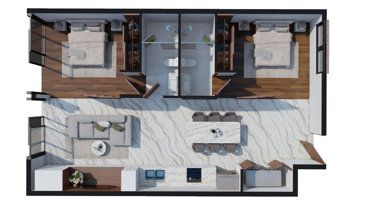 El modelo Carrara B se encuentra en el piso 3, que es el nivel más alto del edificio, cuenta con dos recámaras, dos baños completos, sala, área de lavado, cocina, cajón de estacionamiento y bodega individual.