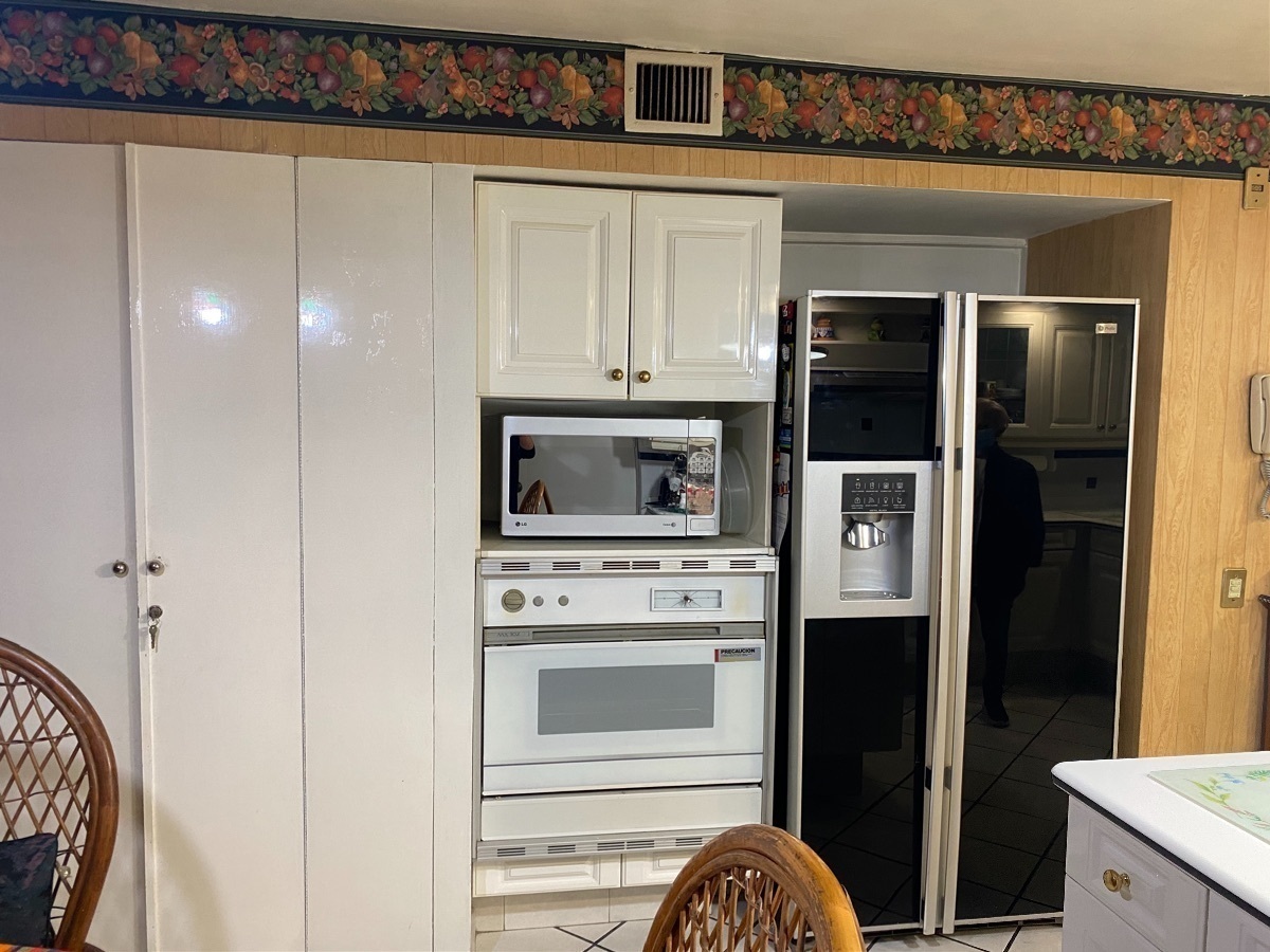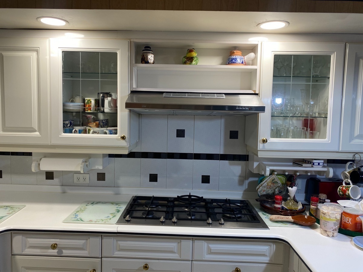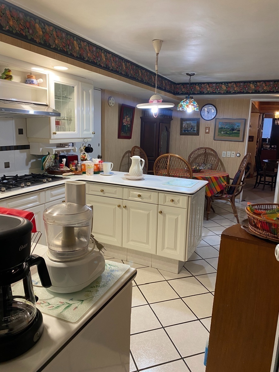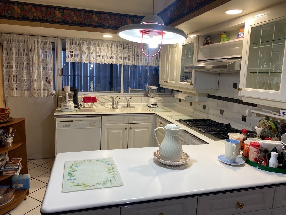 Amplia cocina en color blanco con área para desayunador y espacios para almacenaje