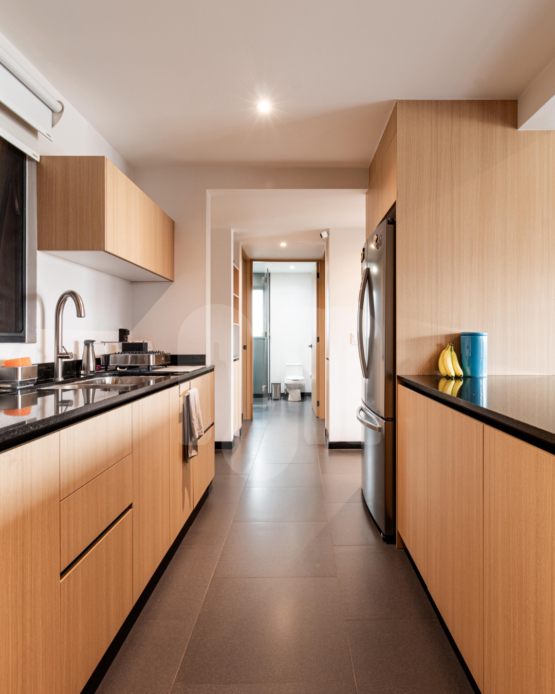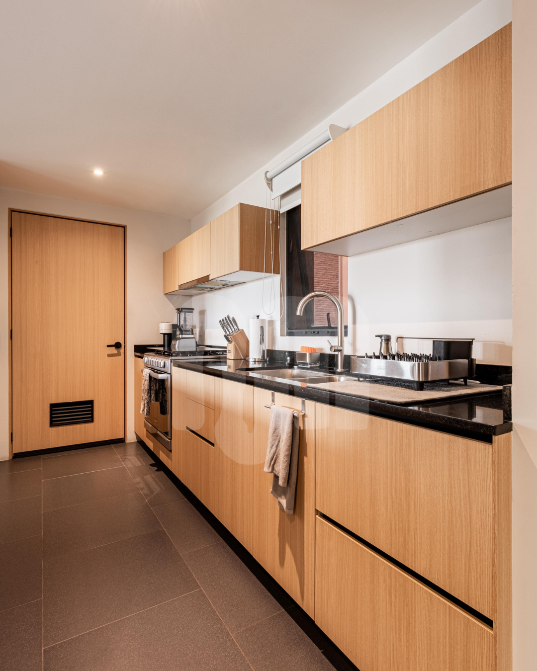 - Cocina integral equipada con barra de granito como desayunador.