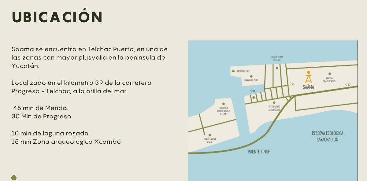 SAÁMA está localizado em Telchac Puerto, em uma das áreas com maior valorização na península de Yucatán. Localizado no quilômetro 39 da estrada Progreso - Telchac, à beira-mar.