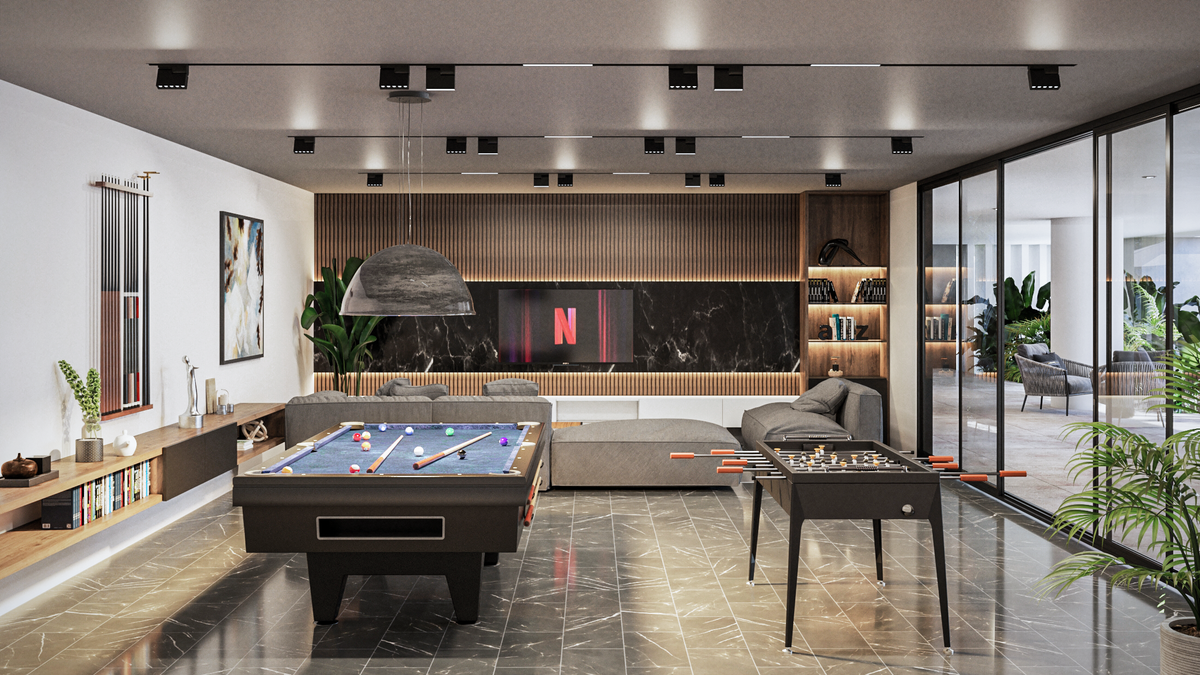 Sala de jogos com televisão, pebolim, Wifi e banheiros.