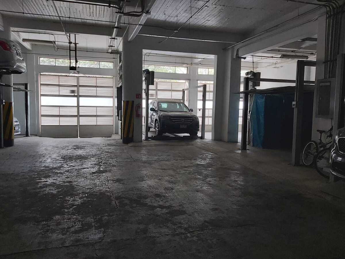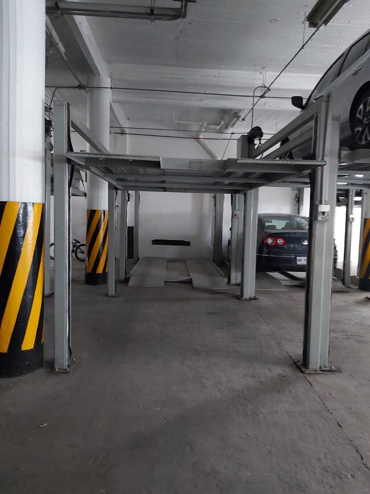 Un lugar de estacionamiento con eleva auto (auto mediano). Hay una persona que suele estacionar los autos para facilitar el movimiento, dentro del horario de trabajo del conserje.