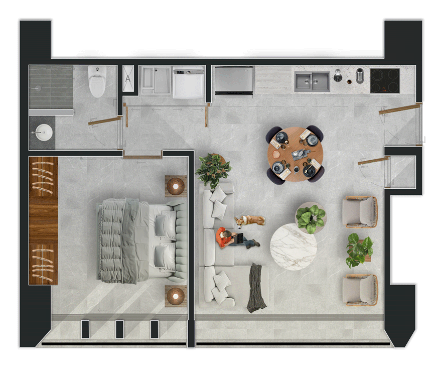 O modelo tipo A varia de 52,48 a 55,61 m2, e está disponível com ou sem terraço.