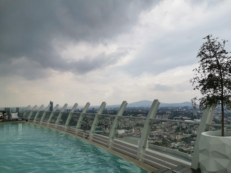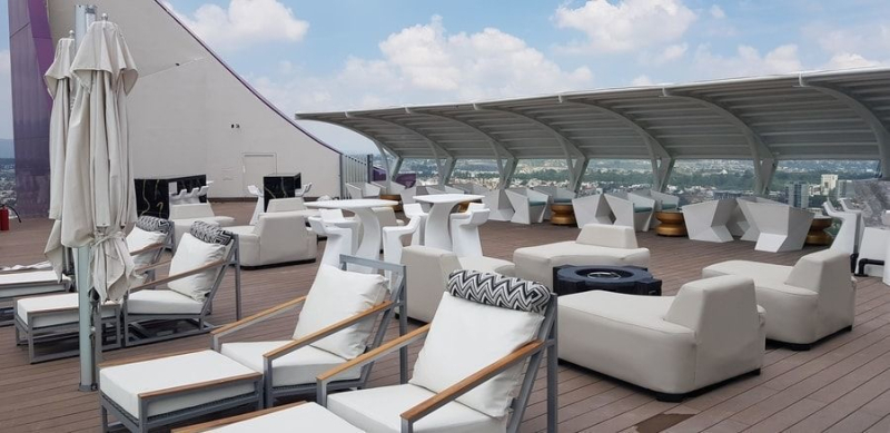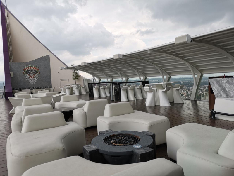 Sala lounge con bar junto a la alberca con vista 360 grados a la ciudad, roof top