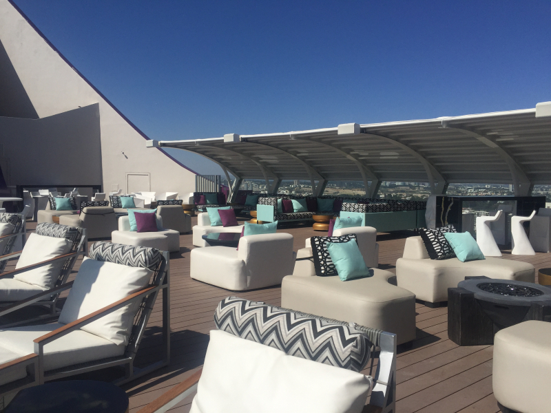 Sky Pool con vista panorámica y zona de camastros y servicio de restaurante bar